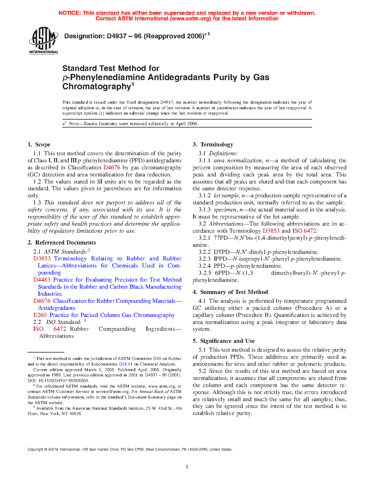 5.1 This test method is designed to assess the relative purity of production PPDs. These additives are primarily used as antiozonants for tires and other rubber or polymeric products.
