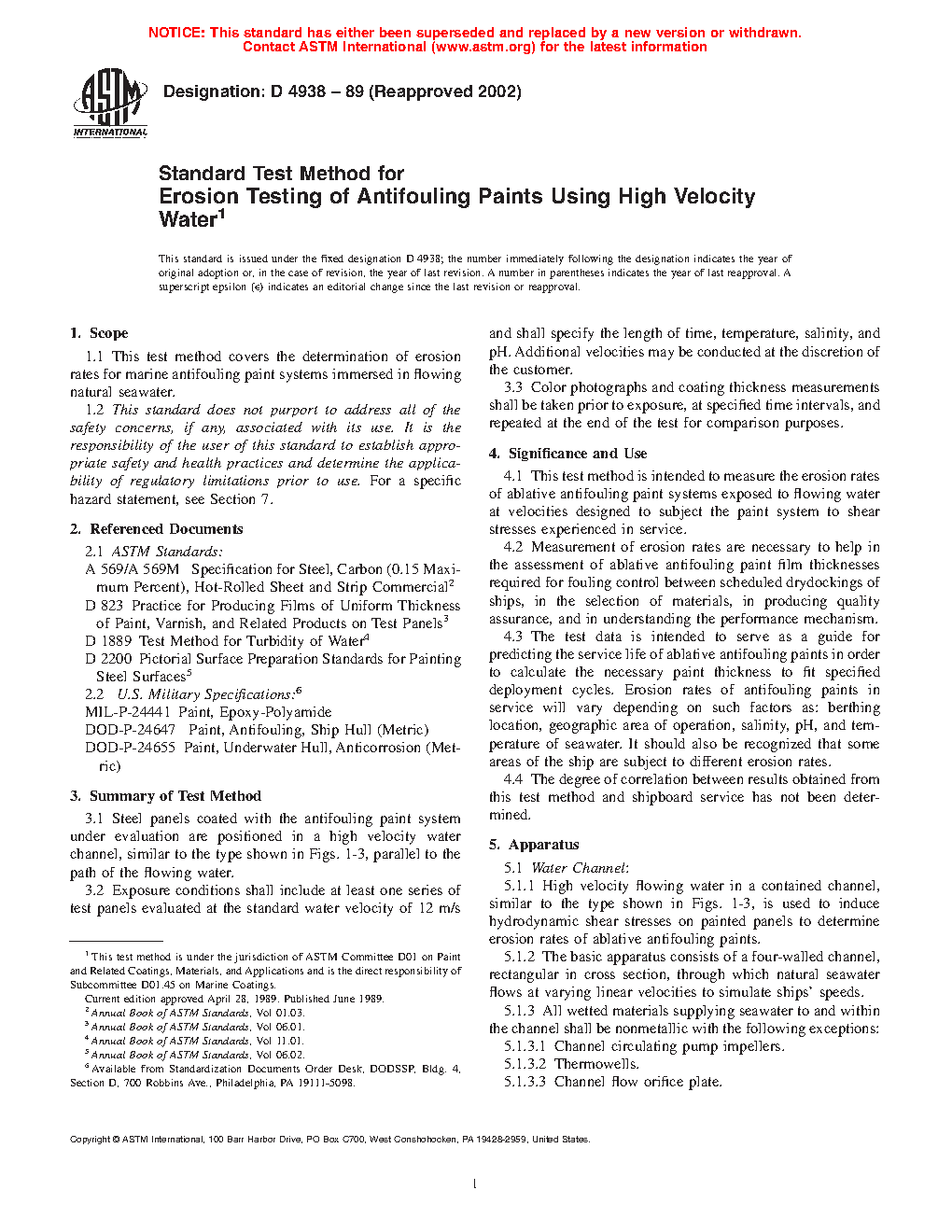 4.1 This test method is intended to measure the erosion rates of ablative antifouling paint systems exposed to flowing water at velocities designed to subject the paint system to shear stresses experienced in service.