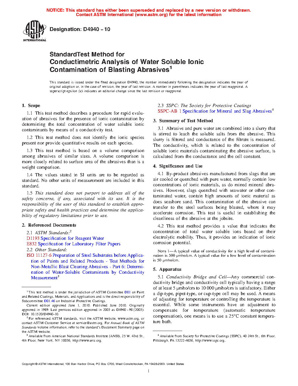 4.3 Abrasive standards published by SSPC (AB) and ISO 11126 provide tolerance levels for water soluble contaminants of the abrasive.