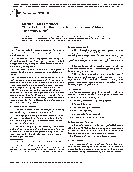 1.1 These test methods cover two procedures for determining the amount of water picked up by lithographic printing inks in a laboratory mixer.