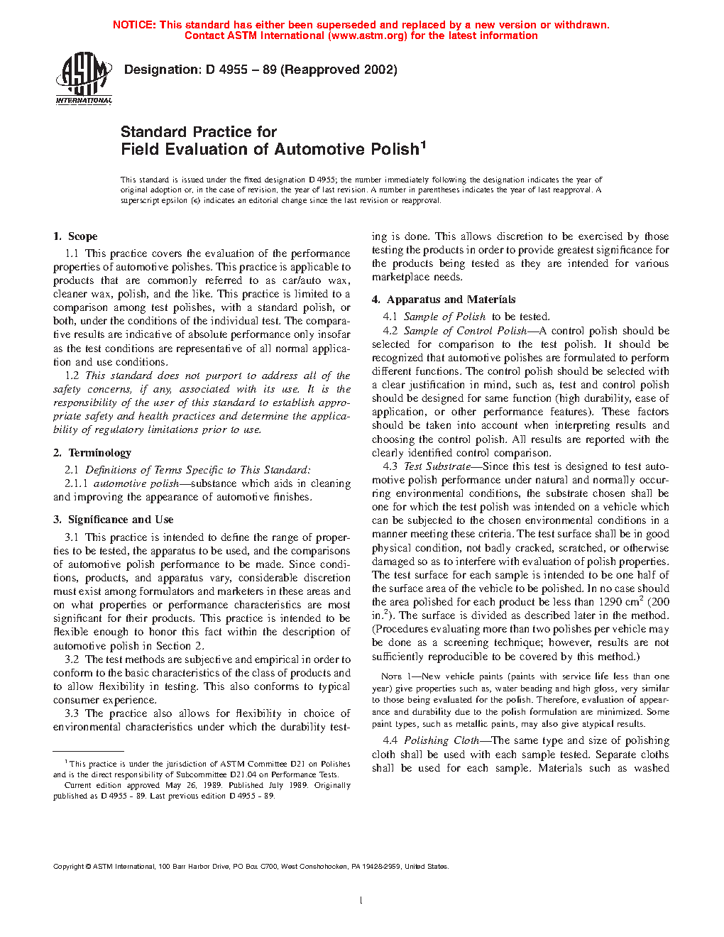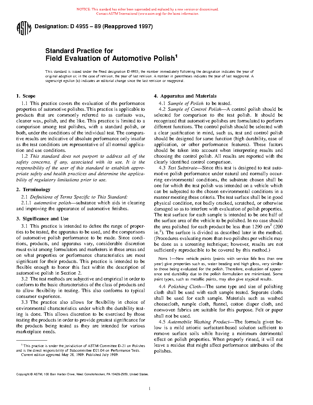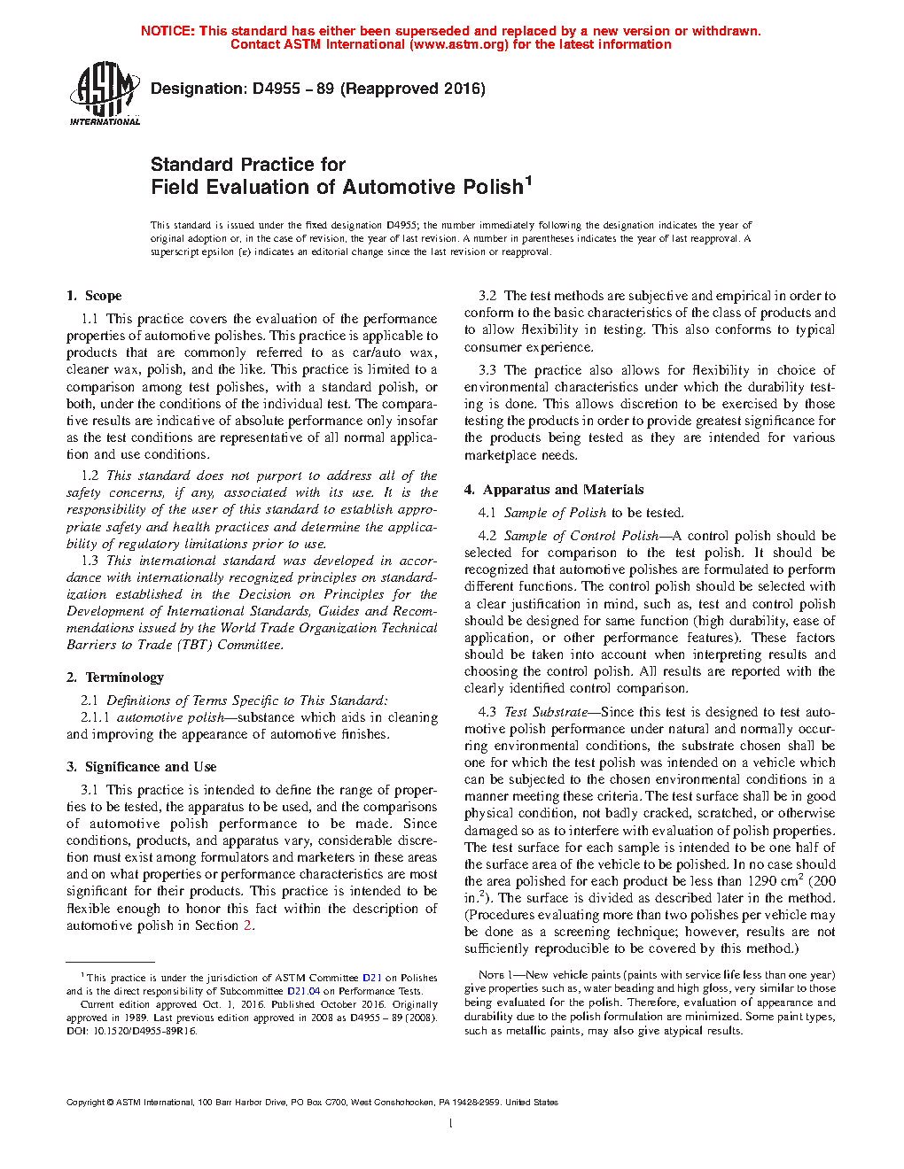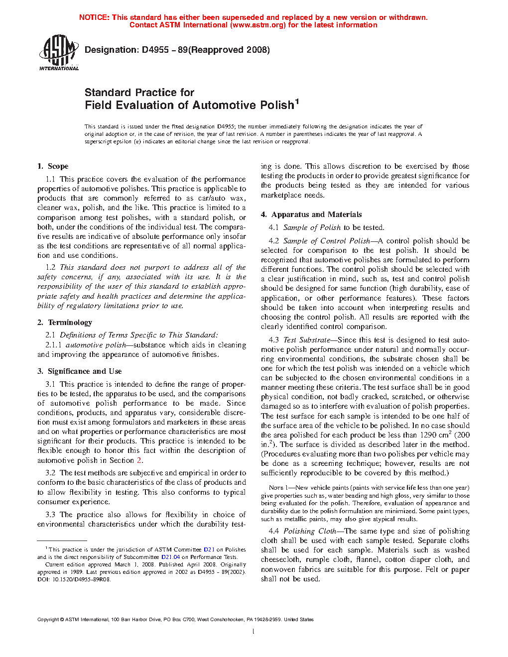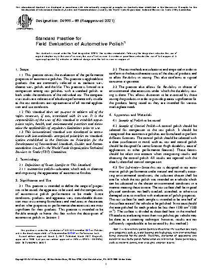 1.1 This practice covers the evaluation of the performance properties of automotive polishes. This practice is applicable to products that are commonly referred to as car/auto wax, cleaner wax, polish, and the like. This practice is limited to a comparison among test polishes, with a standard polish, or both, under the conditions of the individual test. The comparative results are indicative of absolute performance only insofar as the test conditions are representative of all normal application and use conditions.