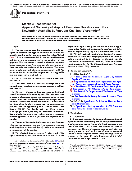 1.1 This test method describes procedures primarily designed to determine the apparent viscosities of residues obtained by distilling asphalt emulsions according to Test Method D6997. It is also recommended for use on non-Newtonian asphalts at any temperature within the capability of the apparatus. This test method is useful in characterizing rheological properties of non-Newtonian asphalts as a function of shear rate under the conditions of the test method. This test is run in straight open-end tube viscometers, normally at 60 °C, but is suitable for use at other temperatures. It is applicable over the range from 5 to 50 000 Pa·s.