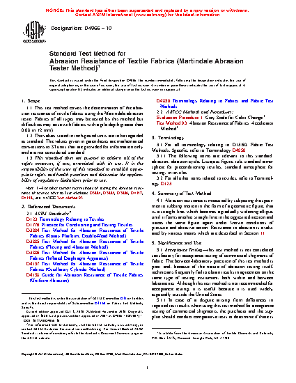 1.3 This standard does not purport to address all of the safety concerns, if any, associated with its use. It is the responsibility of the user of this standard to establish appropriate safety and health practices and determine the applicability of regulatory limitations prior to use. Note 1—For other current test methods of testing the abrasion resistance of textiles refer to Test Methods D3884, D3885, D3886, D4157, D4158, and AATCC Test Method 93.