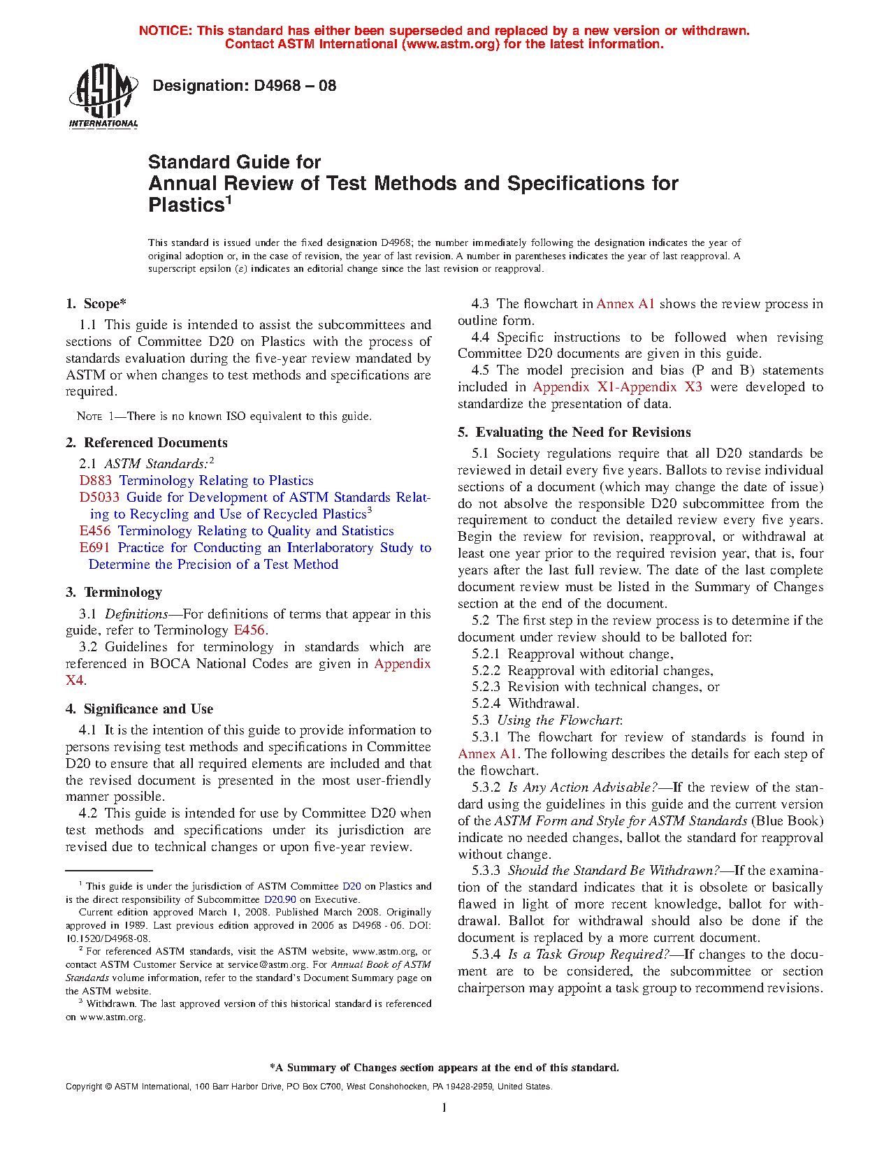 1.1 This practice is intended to assist the subcommittees and sections of Committee D20 on Plastics with the process of standards evaluation during the five-year review mandated by ASTM or when changes to test methods and specifications are required. It is intended to complement the Form and Style for ASTM Standards (“Blue Book”) not replace it.