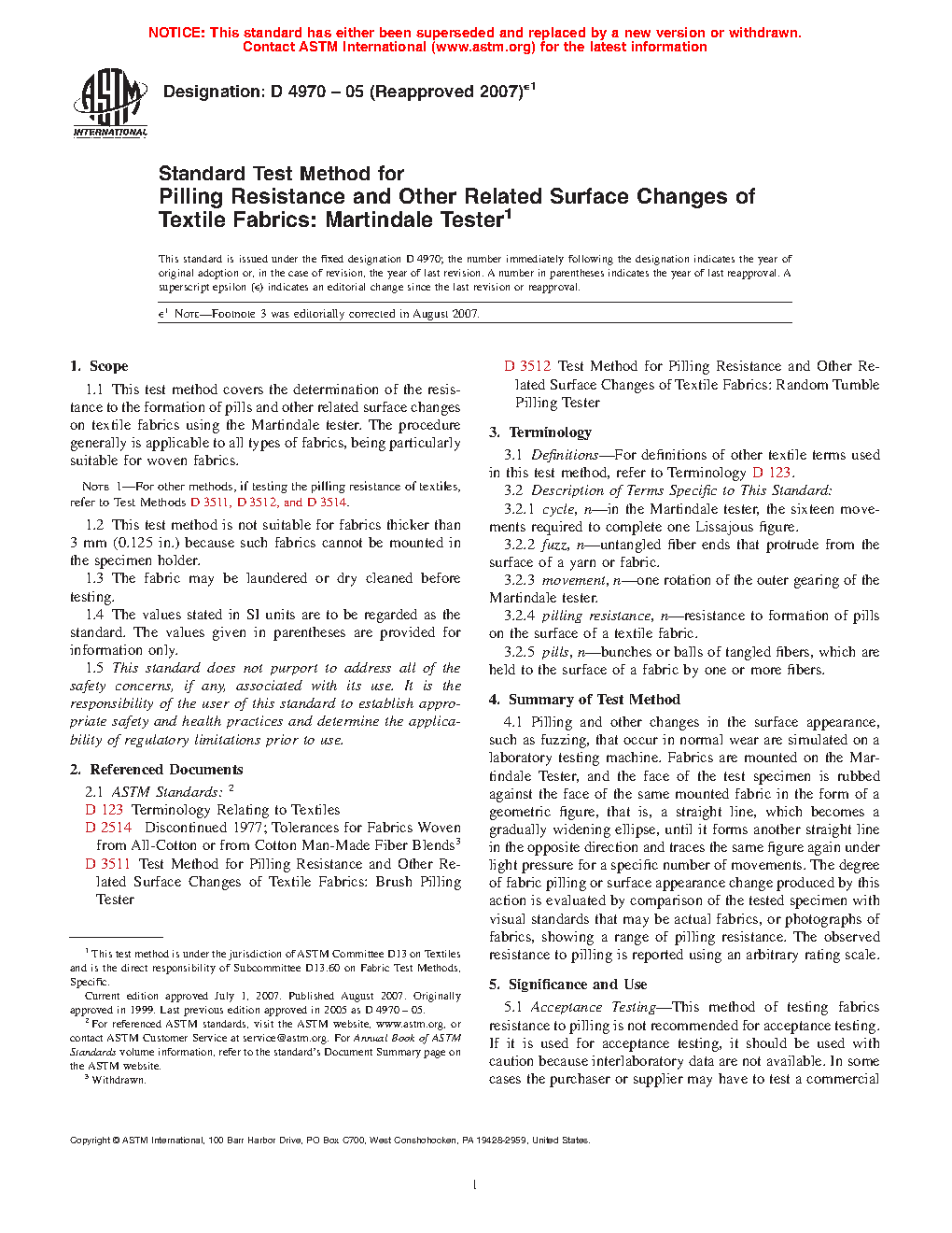 Note 1—For other methods, if testing the pilling resistance of textiles, refer to Test Methods D 3511, D 3512, and D 3514