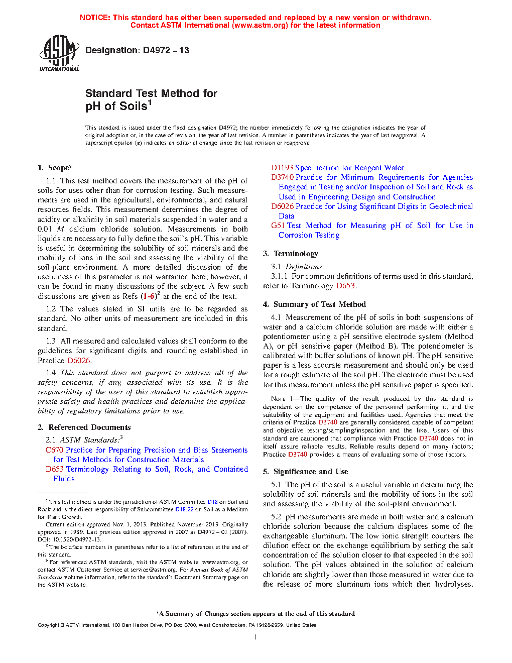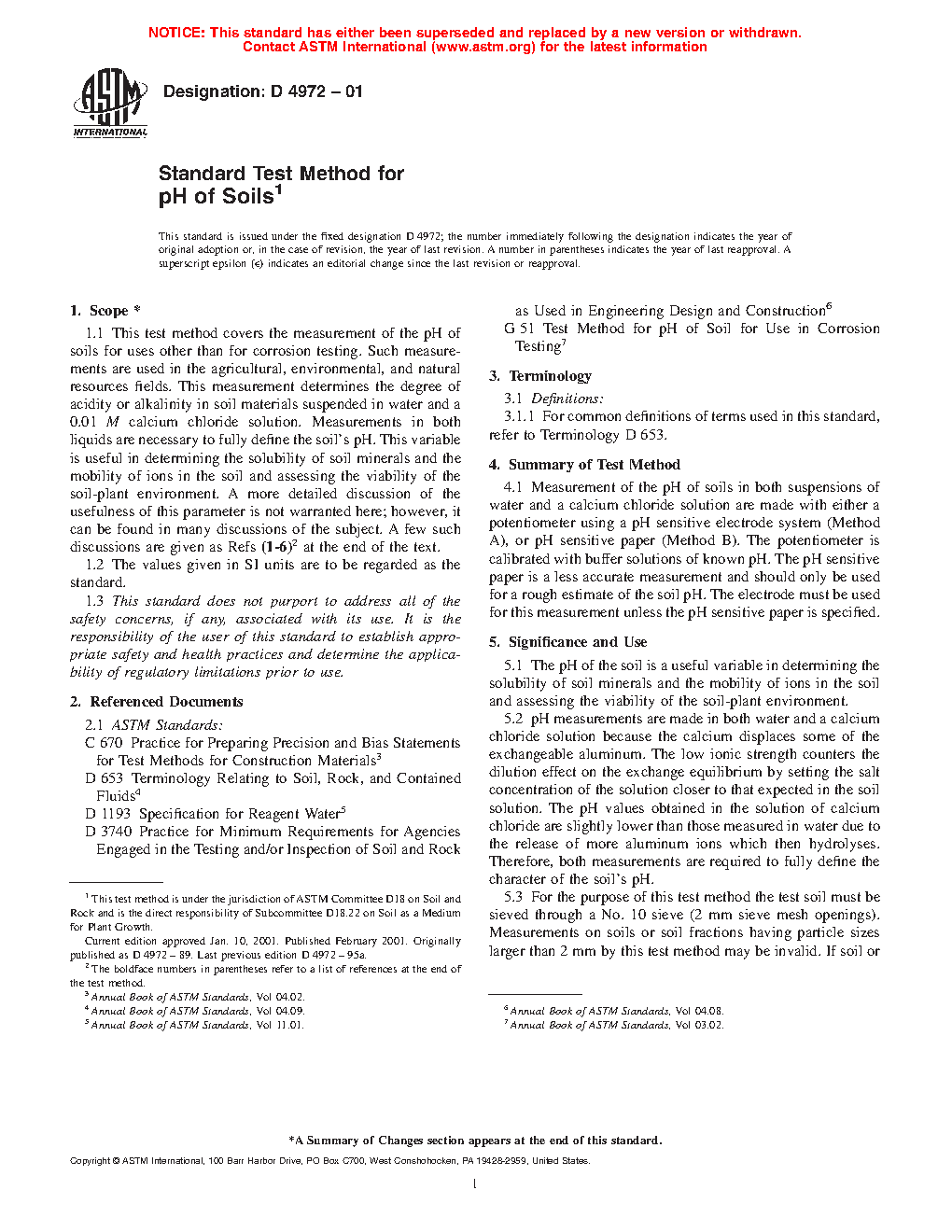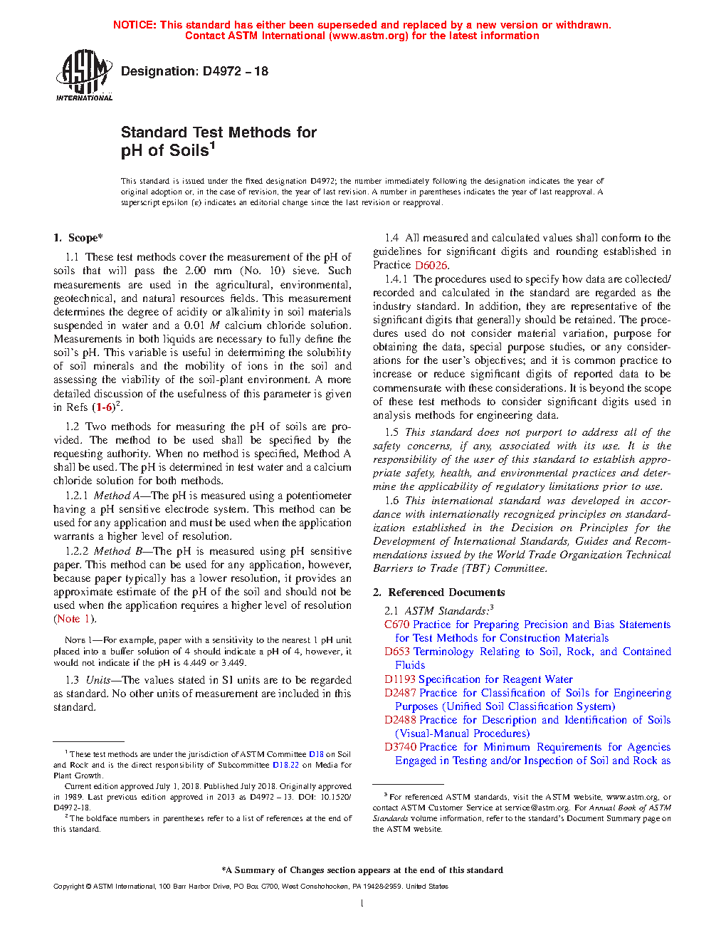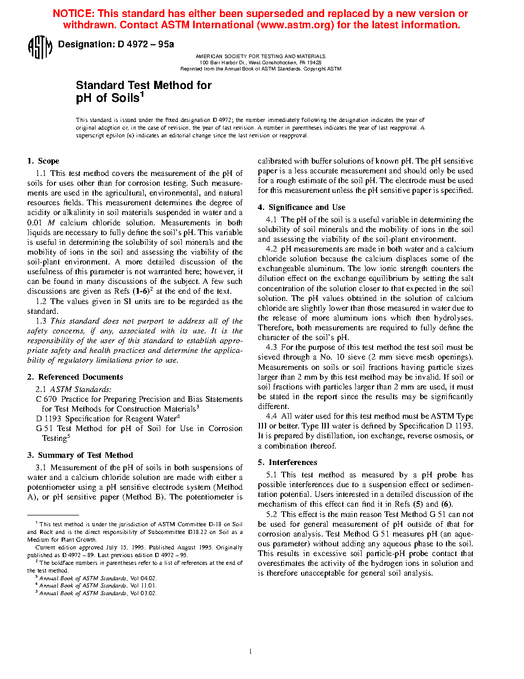 1.2 Two methods for measuring the pH of soils are provided. The method to be used shall be specified by the requesting authority. When no method is specified, Method A shall be used. The pH is determined in test water and a calcium chloride solution for both methods.