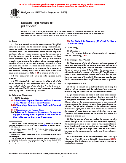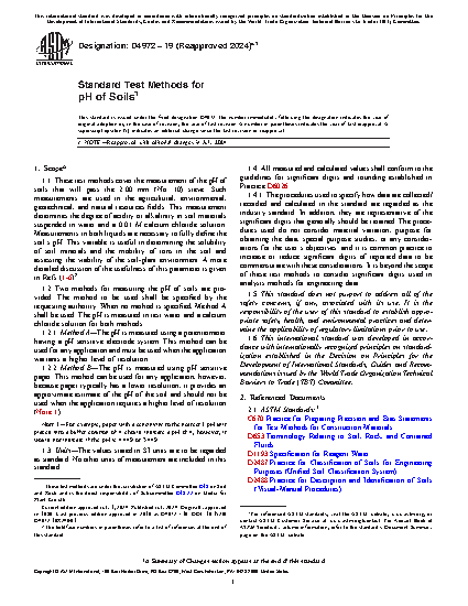 1.1 These test methods cover the measurement of the pH of soils that will pass the 2.00 mm (No. 10) sieve. Such measurements are used in the agricultural, environmental, geotechnical, and natural resources fields. This measurement determines the degree of acidity or alkalinity in soil materials suspended in water and a 0.01 M calcium chloride solution. Measurements in both liquids are necessary to fully define the soil's pH. This variable is useful in determining the solubility of soil minerals and the mobility of ions in the soil and assessing the viability of the soil-plant environment. A more detailed discussion of the usefulness of this parameter is given in Refs (1-6)2.