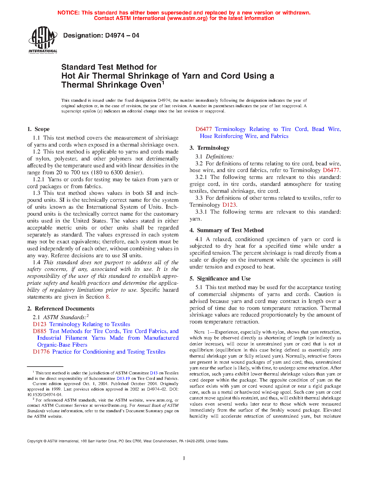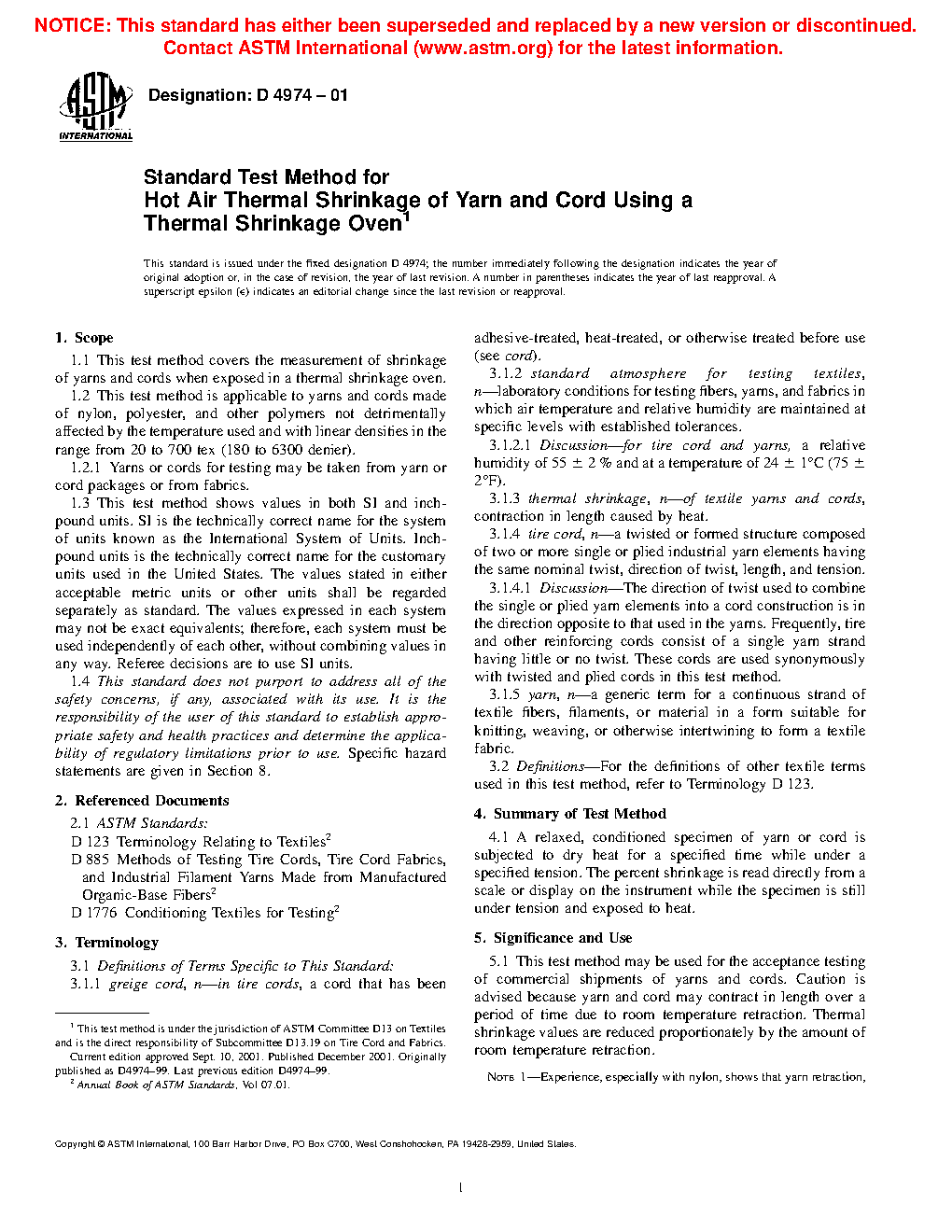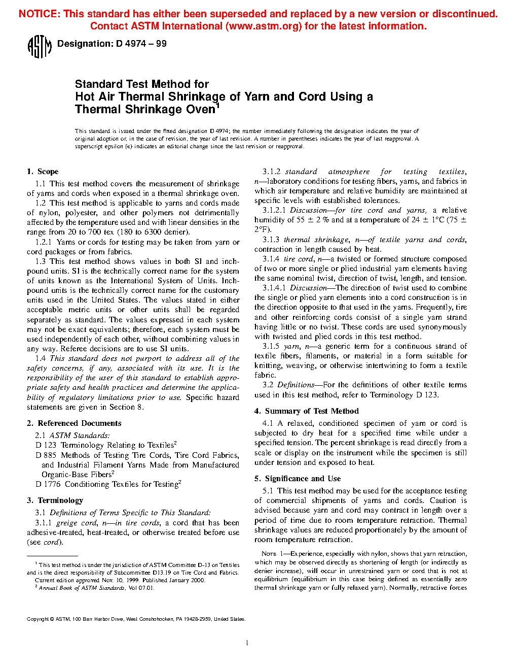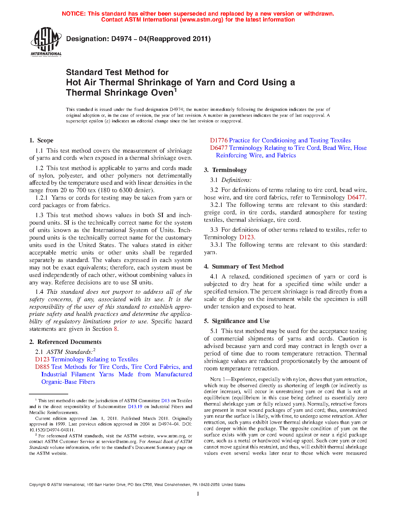 5.5 This test method is similar to the procedures of Methods D885 for the determination of thermal shrinkage of yarns and cords. Shrinkage is measured while the specimen is within an oven and tensioned as specified in Methods D885;D885 however, there are enough vagaries among different units of apparatus for measurement of thermal shrinkage that numerical equivalence between units of different design should not be assumed, even under the same nominal conditions.