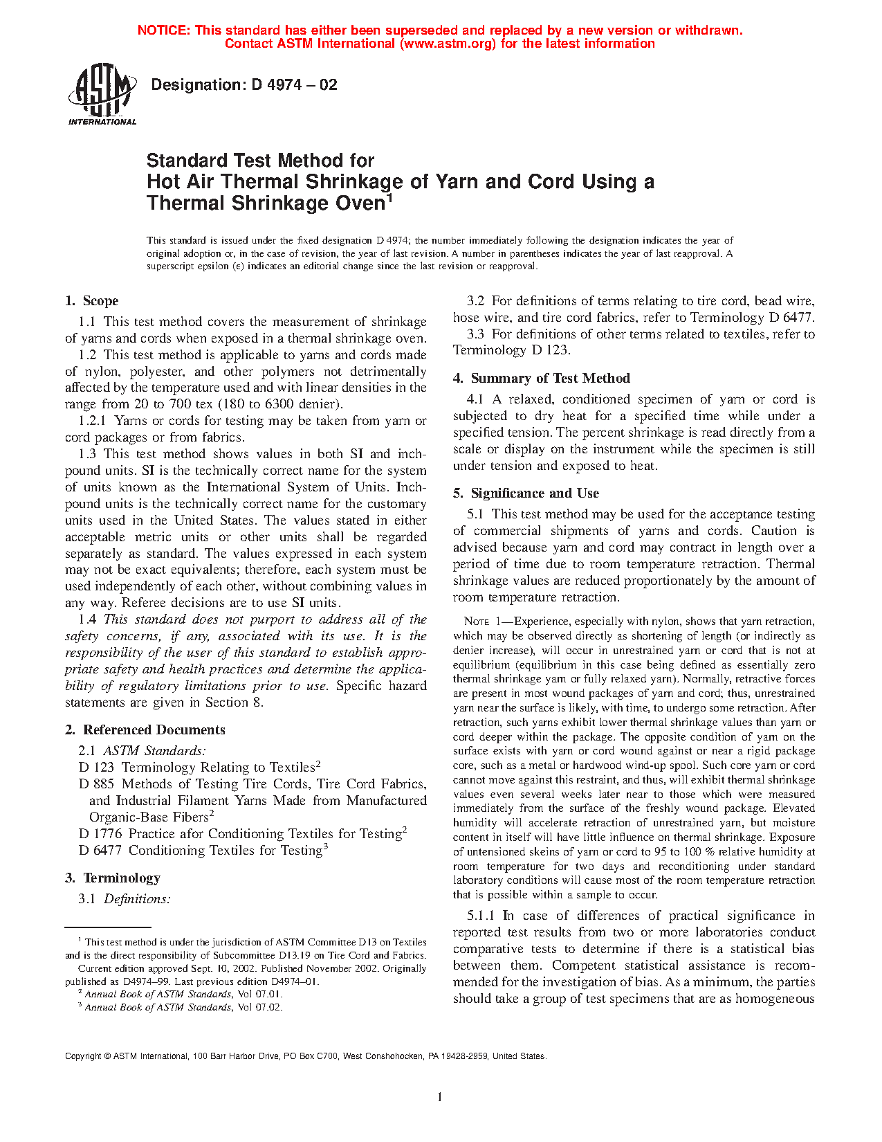 5.1 This test method may be used for the acceptance testing of commercial shipments of yarns and cords. Caution is advised because yarn and cord may contract in length over a period of time due to room temperature retraction. Thermal shrinkage values are reduced proportionately by the amount of room temperature retraction.