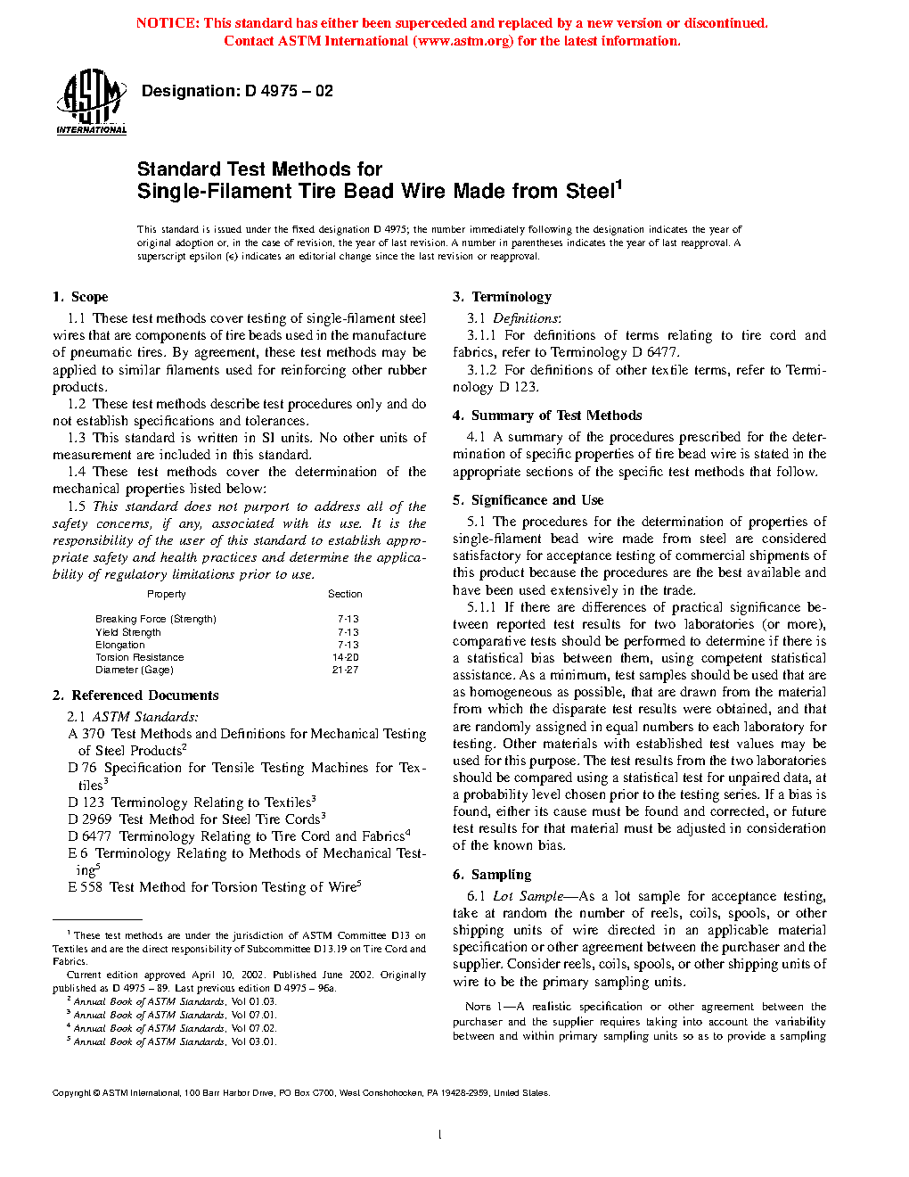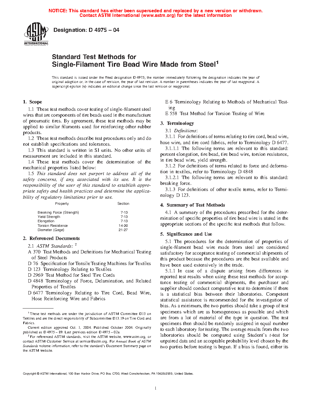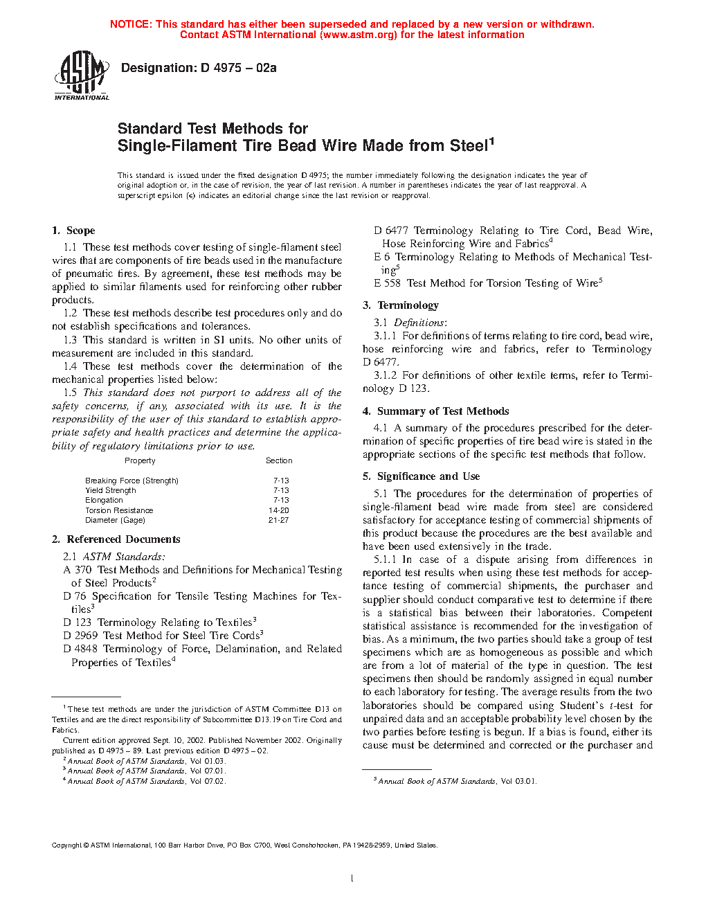 5.1 The procedures for the determination of properties of single-filament bead wire made from steel are considered satisfactory for acceptance testing of commercial shipments of this product because the procedures are the best available and have been used extensively in the trade.