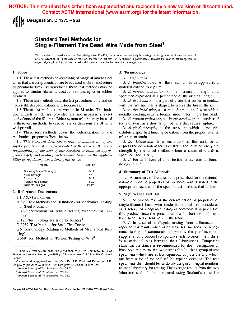 1.1 These test methods cover testing of single-filament steel wires that are components of tire beads used in the manufacture of pneumatic tires. By agreement, these test methods can be applied to similar filaments used for reinforcing other rubber products.