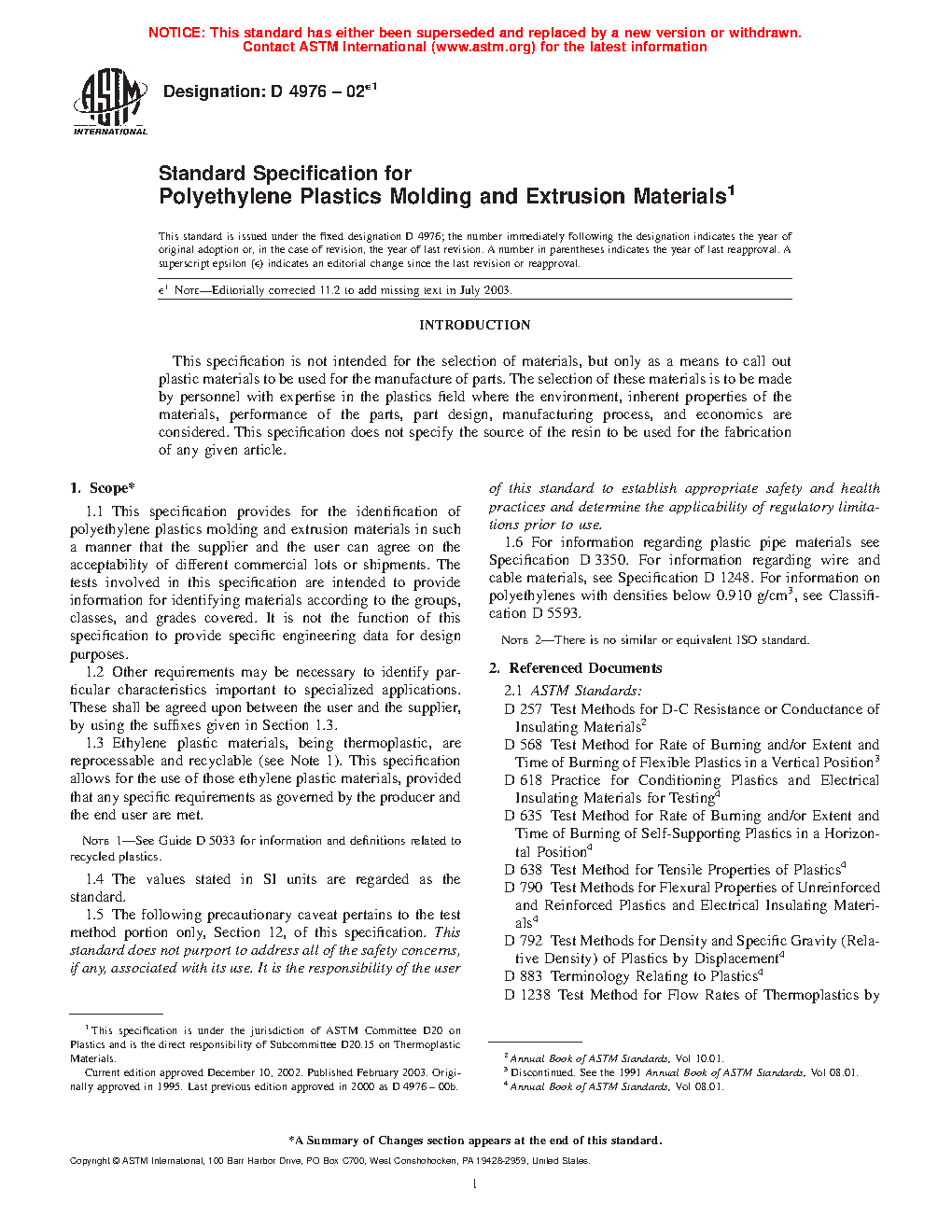 1.3 Ethylene plastic materials, being thermoplastic, are reprocessable and recyclable (see Note 1). This specification allows for the use of those ethylene plastic materials, provided that any specific requirements as governed by the producer and the end user are met.
