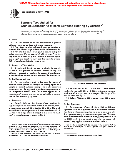 This test method is used to determine the quality of adhesion of the granular surfacing to the coating asphalt in a sample of mineral surfaced roofing. The results determine compliance with the applicable specification requirements or for comparative analysis. This test method applies to “as manufactured” material and may not be applicable to material that has had weathering exposure.