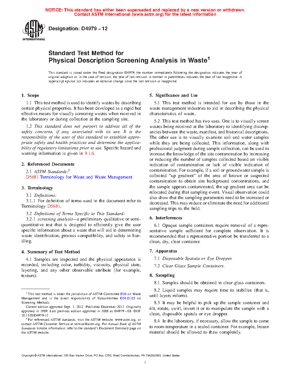 1.1 This practice is used to identify wastes by describing certain physical properties. It has been developed as a rapid but effective means for visually screening wastes when received in the laboratory or during collection at the sampling site.