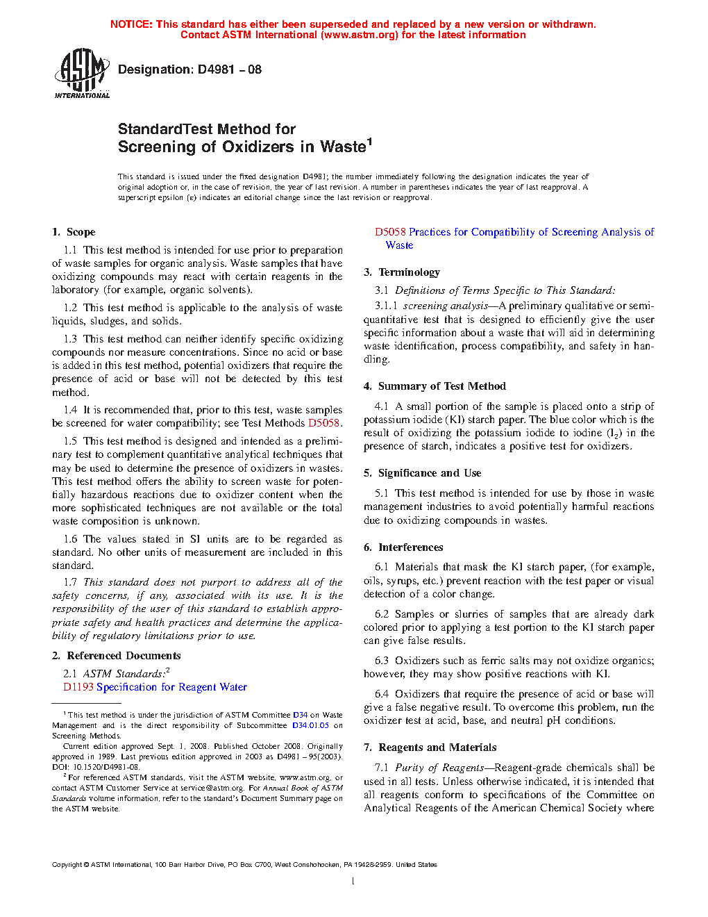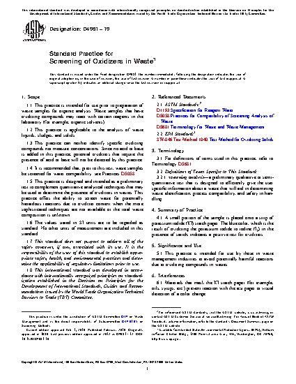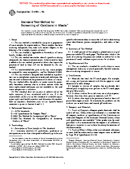 1.1 This test method is intended for use prior to preparation of waste samples for organic analysis. Waste samples that have oxidizing compounds may react with certain reagents in the laboratory (for example, organic solvents).