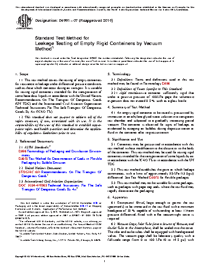 1.1 This test method covers the testing of empty containers for resistance to leakage under differential pressure conditions such as those which can occur during air transport. It is suitable for testing rigid containers intended for the transportation of some hazardous liquids in accordance with the United Nations Recommendations On The Transport Of Dangerous Goods (UN TDG) and the International Civil Aviation Organization Technical Instructions For The Safe Transport Of Dangerous Goods By Air (ICAO TIs).