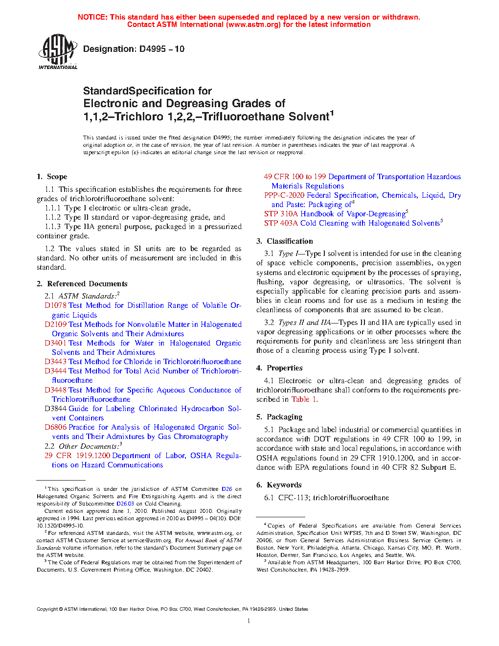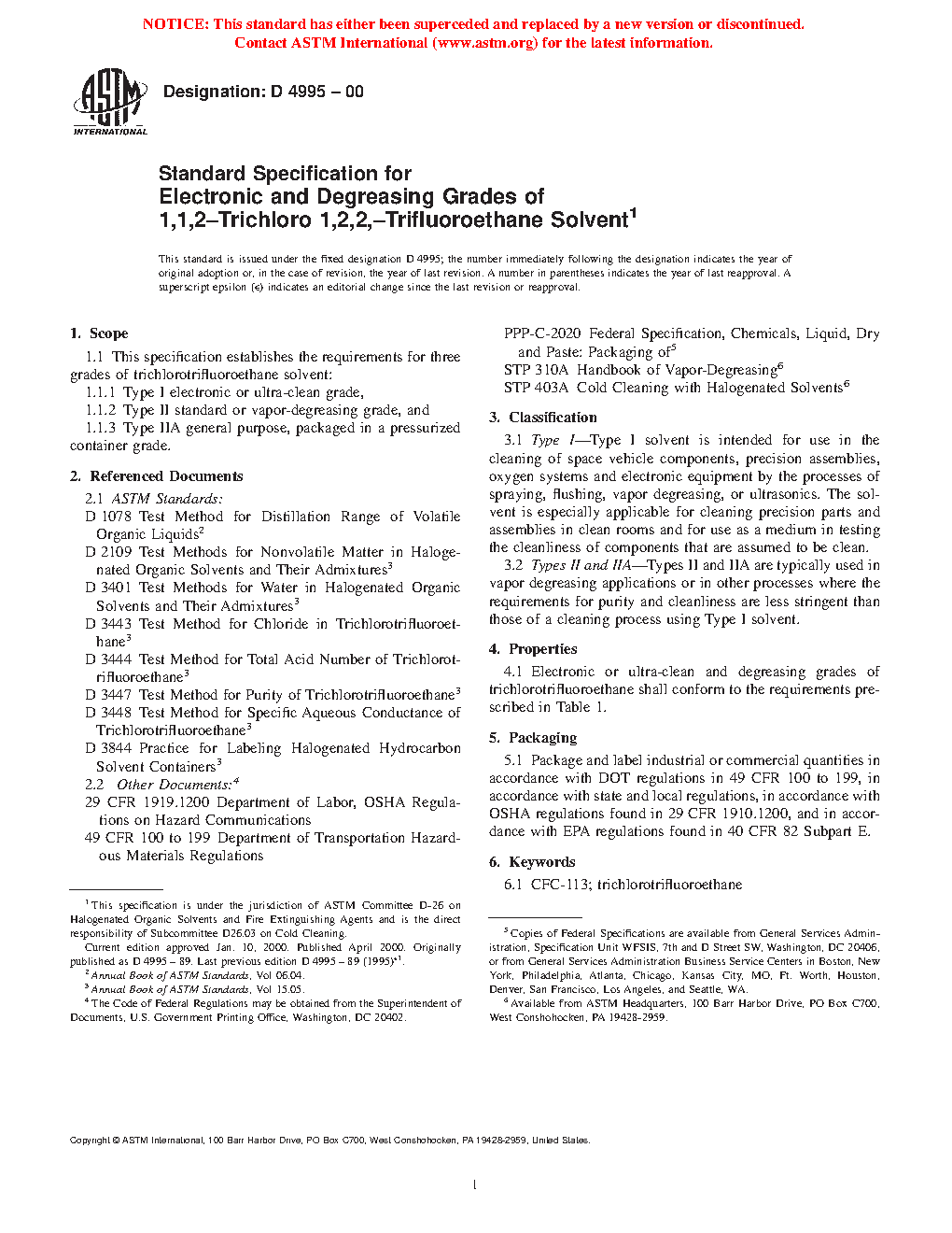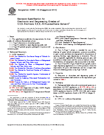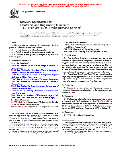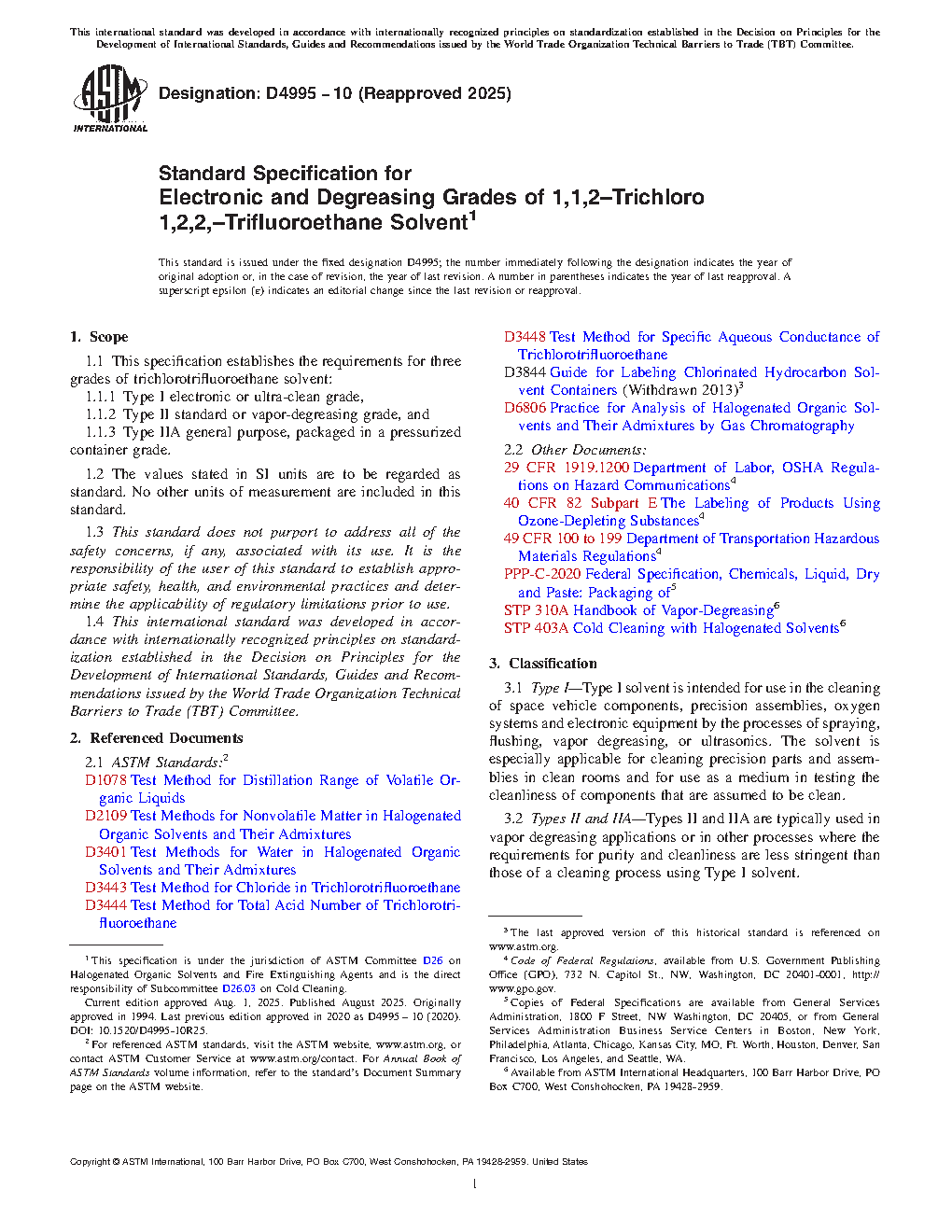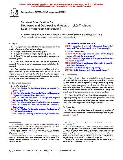 1.1 This specification establishes the requirements for three grades of trichlorotrifluoroethane solvent: