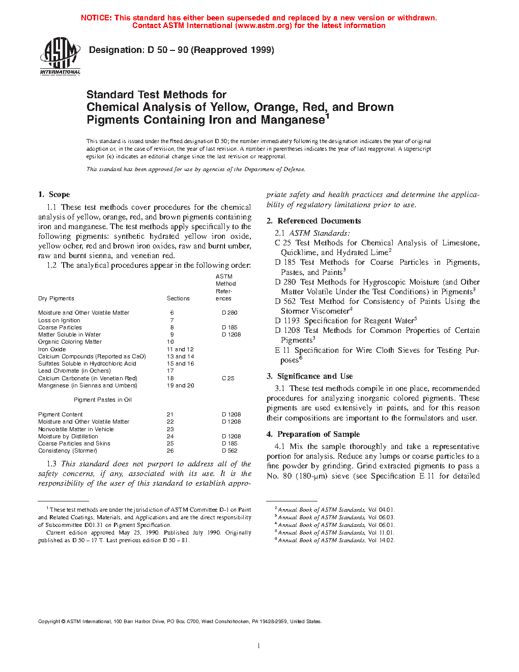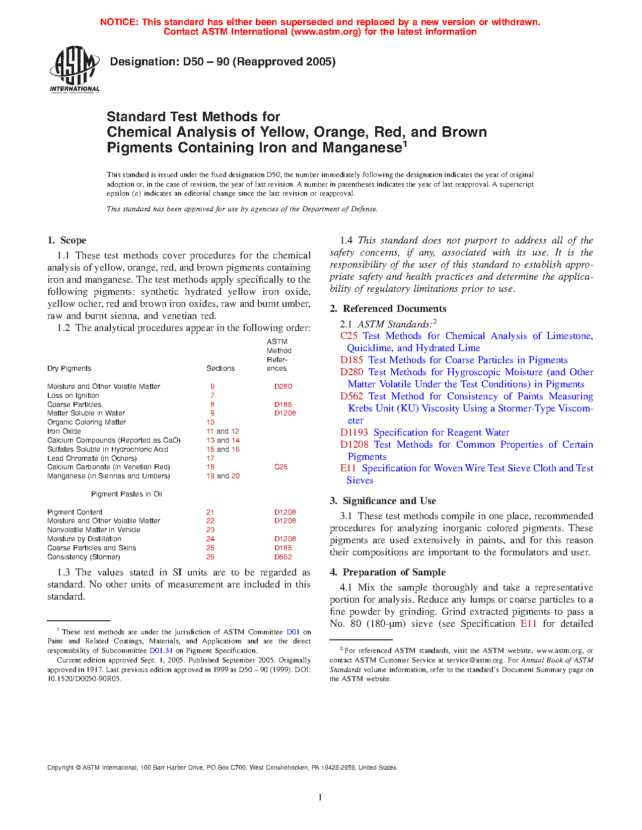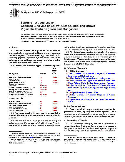 1.1 These test methods cover procedures for the chemical analysis of yellow, orange, red, and brown pigments containing iron and manganese. The test methods apply specifically to the following pigments: synthetic hydrated yellow iron oxide, yellow ocher, red and brown iron oxides, raw and burnt umber, raw and burnt sienna, and venetian red.