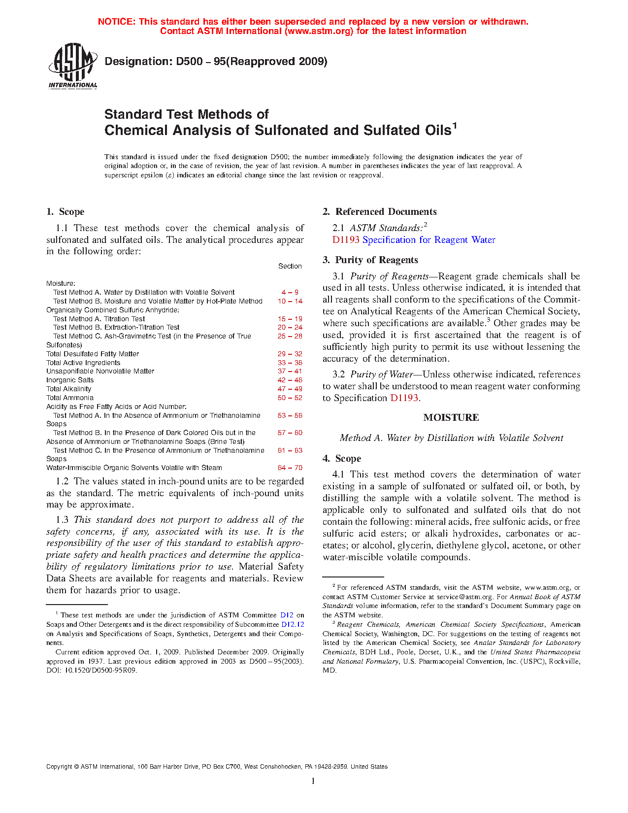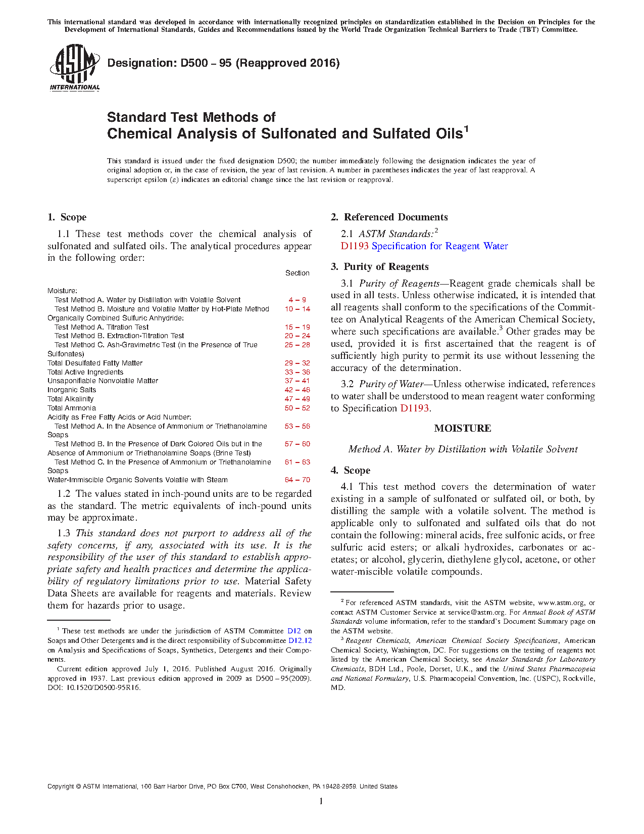These test methods cover the chemical analysis of sulfonated and sulfated oils. Water by distillation with volatile solvent and moisture and volatile matter by hot-plate shall be tested to meet the requirements prescribed. Titration test, extraction-titration test, and ash-gravimetric test shall be performed to meet the requirements specified. Total desulfated fatty matter, total active ingredients, unsaponifiable non-volatile matter, inorganic salts, total alkalinity, and total ammonia shall be tested to meet the requirements prescribed. In the absence of ammonium or triethanolamine soaps test method, brine test method, and in the presence of ammonium or triethanolamine soaps test method shall be performed to meet the requirements prescribed. Water-immiscible organic solvents volatile with steam shall be tested to meet the requirements prescribed.