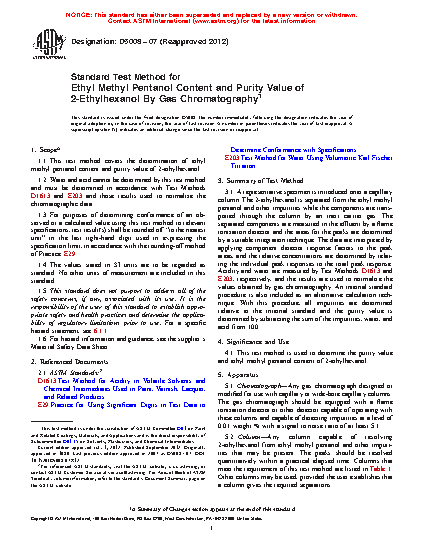 1.1 This test method covers the determination of ethyl methyl pentanol content and purity value of 2-ethylhexanol.