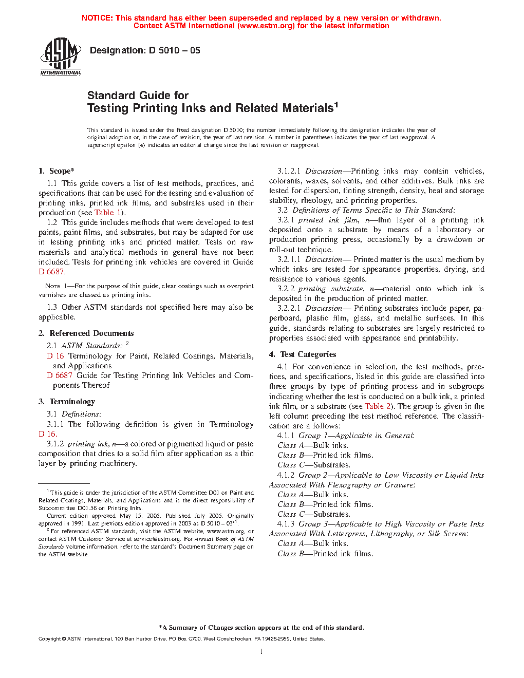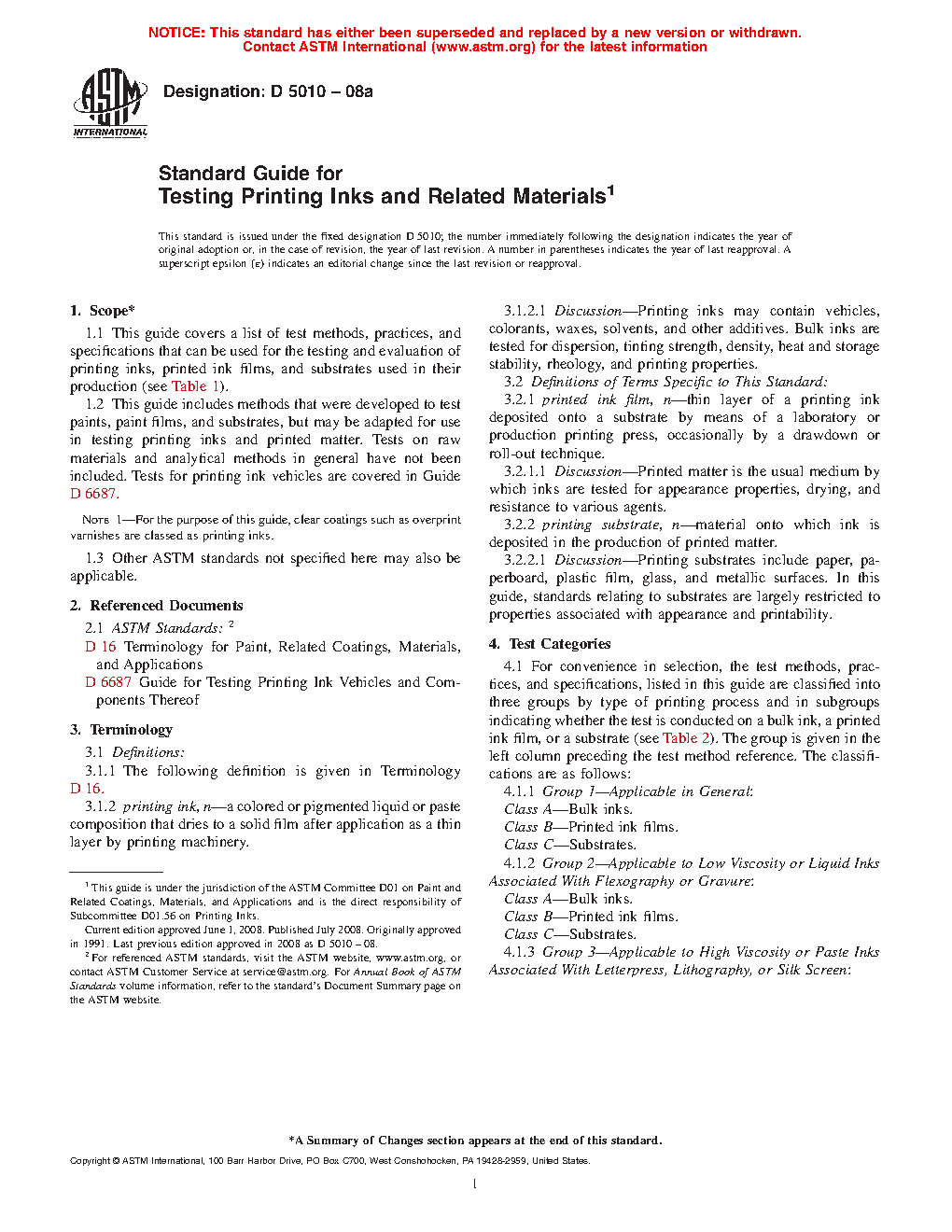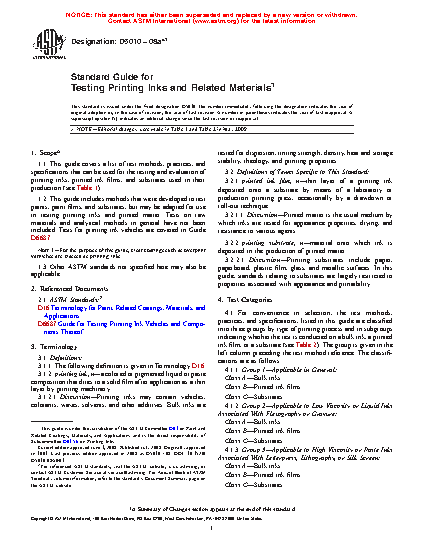 1.2 This guide includes methods that were developed to test paints, paint films, and substrates, but may be adapted for use in testing printing inks and printed matter. Tests on raw materials and analytical methods in general have not been included. Tests for printing ink vehicles are covered in Guide D 6687. Note 1—For the purpose of this guide, clear coatings such as overprint varnishes are classed as printing inks.