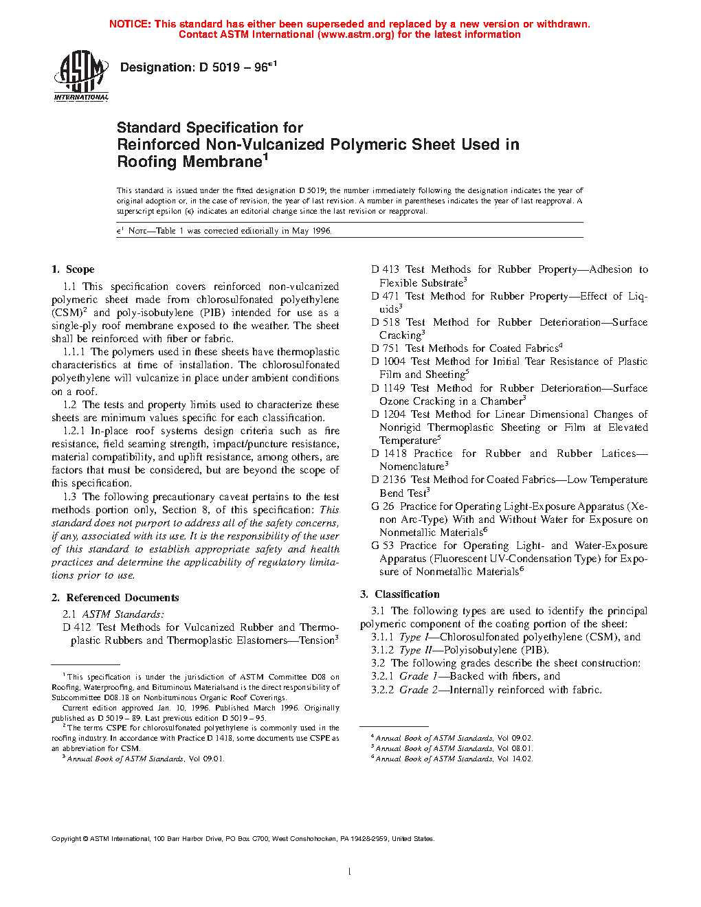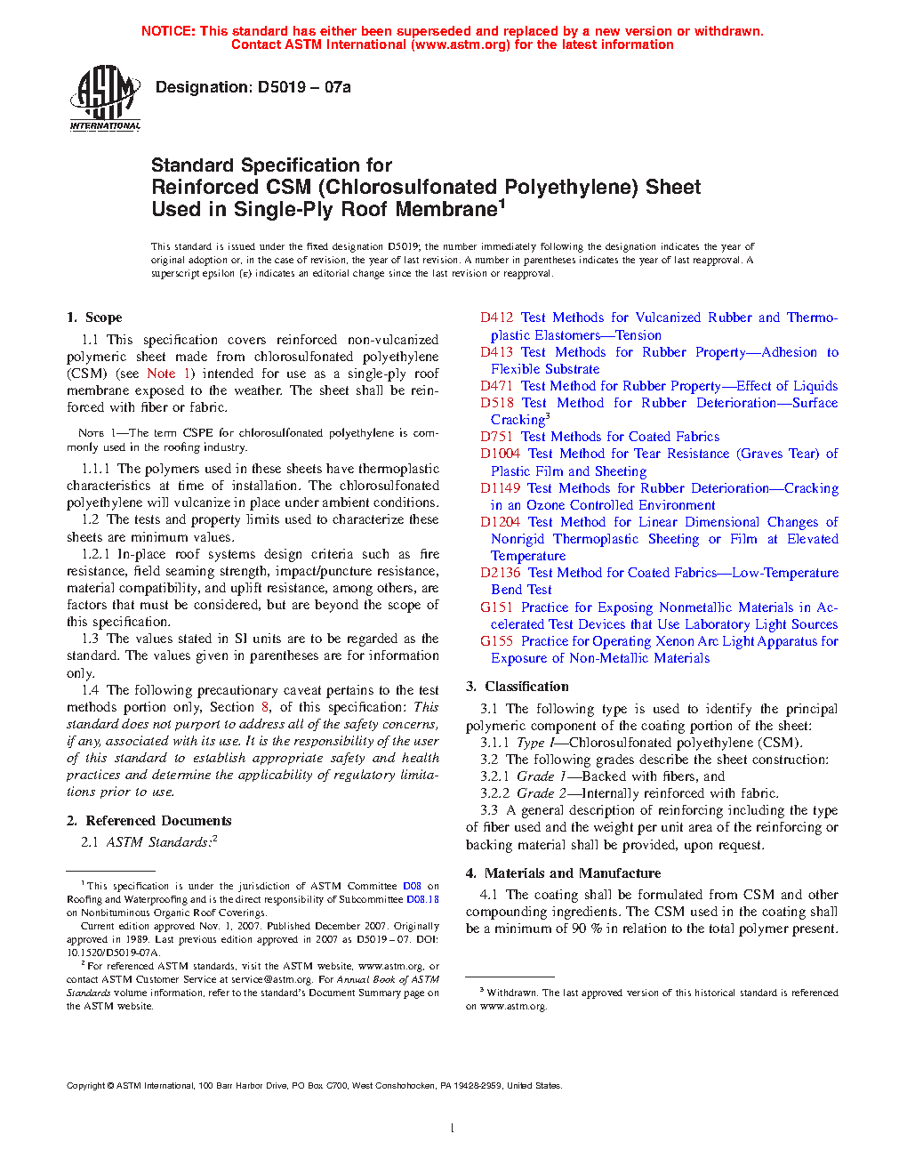 1.1 This specification covers reinforced non-vulcanized polymeric sheet made from chlorosulfonated polyethylene (CSM) (see Note 1 ) intended for use as a single-ply roof membrane exposed to the weather. The sheet shall be reinforced with fiber or fabric.