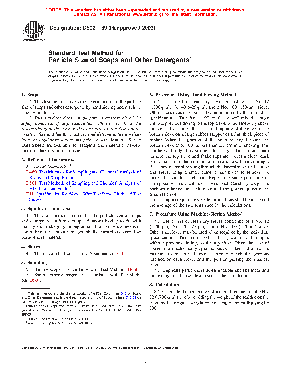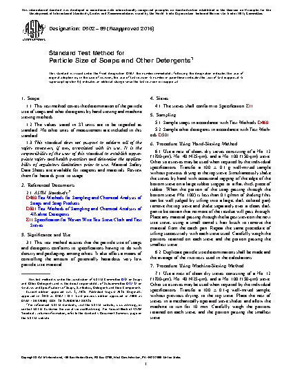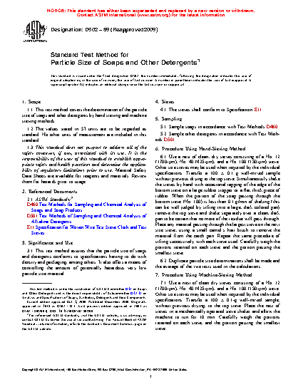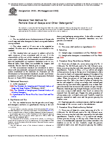 1.1 This test method covers the determination of the particle size of soaps and other detergents by hand sieving and machine sieving methods.