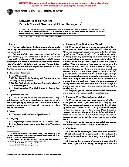 3.1 This test method assures that the particle size of soaps and detergents conforms to specifications having to do with density and packaging, among others. It also offers a means of controlling the amount of potentially hazardous very low particle size material.