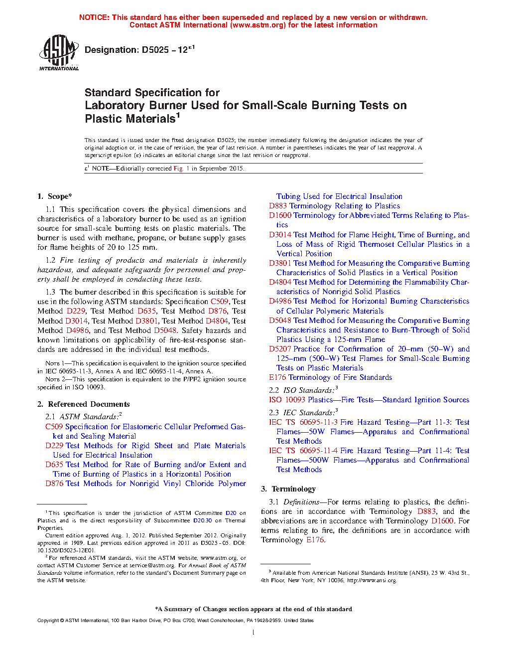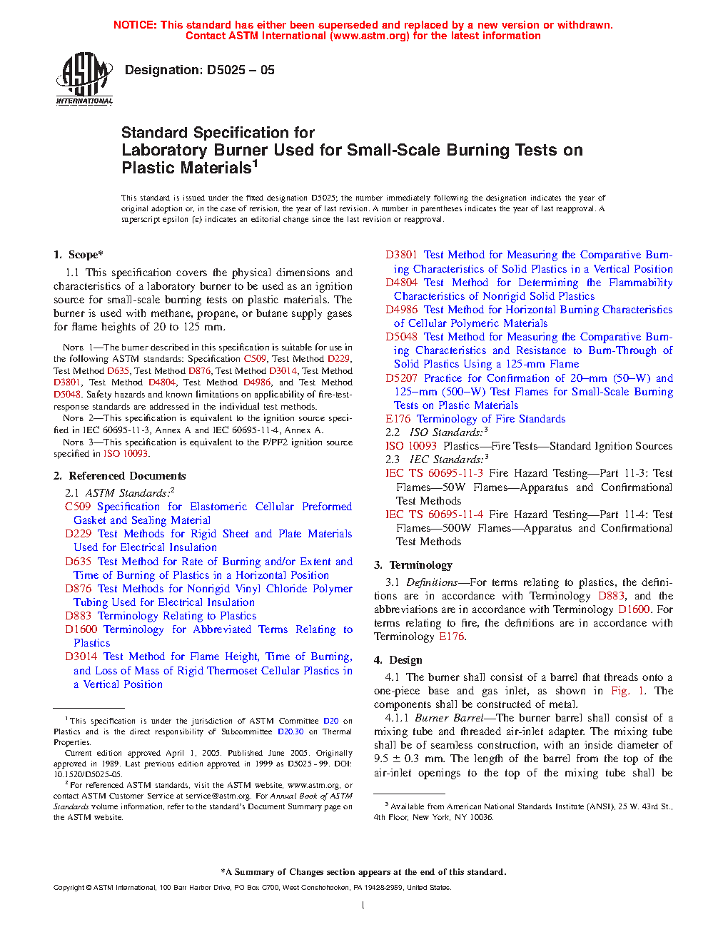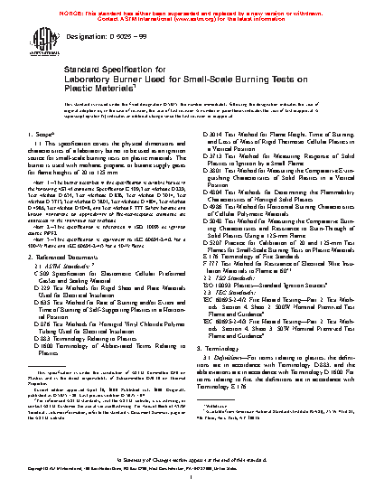 1.3 The burner described in this specification is suitable for use in the following ASTM standards: Specification C509, Test Method D229, Test Method D635, Test Method D876, Test Method D3014, Test Method D3801, Test Method D4804, Test Method D4986, and Test Method D5048. Safety hazards and known limitations on applicability of fire-test-response standards are addressed in the individual test methods.