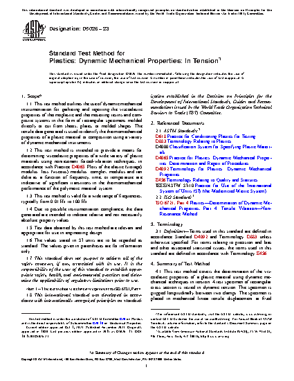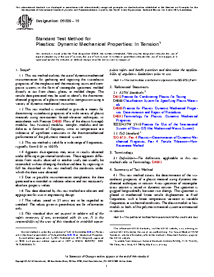 1.1 This test method outlines the use of dynamic mechanical instrumentation for gathering and reporting the viscoelastic properties of thermoplastic and thermosetting resins and composite systems in the form of rectangular specimens molded directly or cut from sheets, plates, or molded shapes. The tensile data generated may be used to identify the thermomechanical properties of a plastic material or composition using a variety of dynamic mechanical instruments.