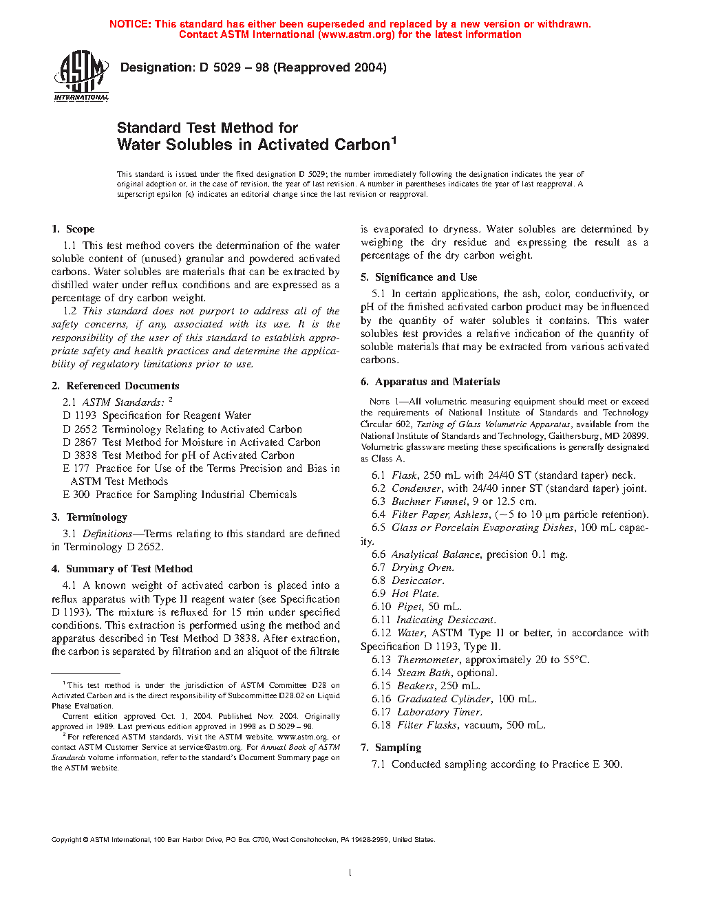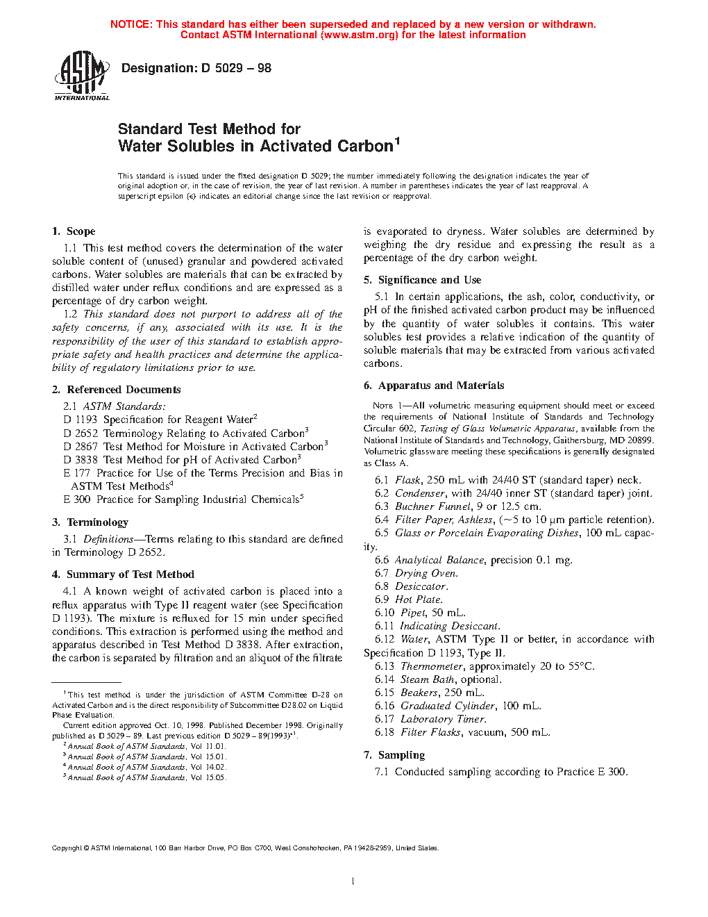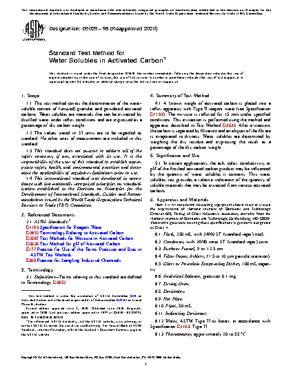 1.1 This test method covers the determination of the water-soluble content of (unused) granular and powdered activated carbons. Water solubles are materials that can be extracted by distilled water under reflux conditions and are expressed as a percentage of dry carbon weight.