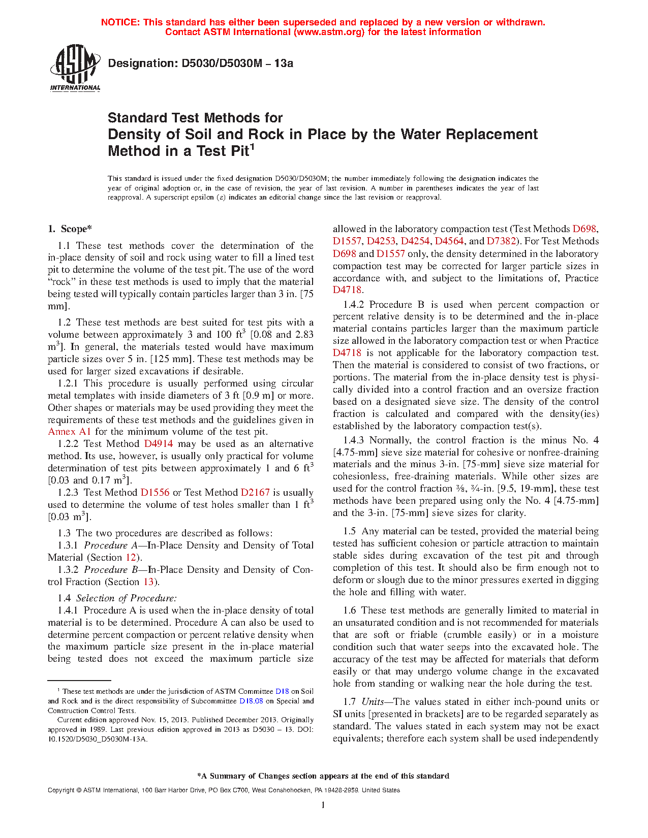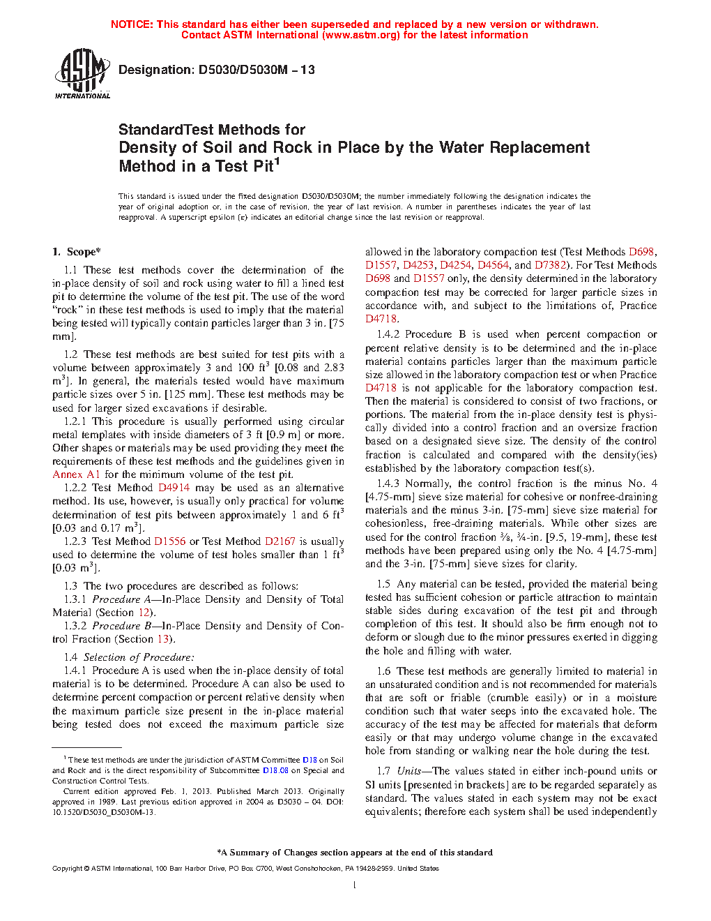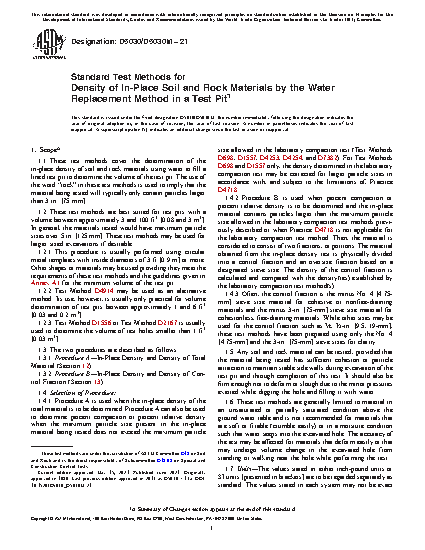 1.1 These test methods cover the determination of the in-place density of soil and rock using water to fill a lined test pit to determine the volume of the test pit. The use of the word “rock” in these test methods is used to imply that the material being tested will typically contain particles larger than 3 in. [75 mm].