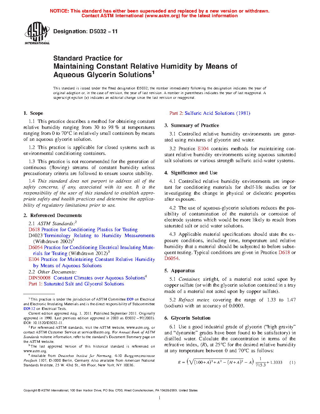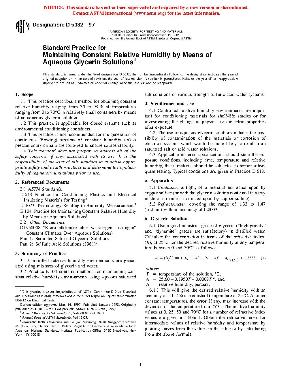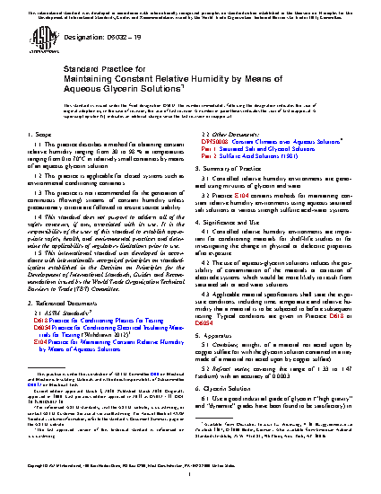 1.1 This practice describes a method for obtaining constant relative humidity ranging from 30 to 98 % at temperatures ranging from 0 to 70°C in relatively small containers by means of an aqueous glycerin solution.