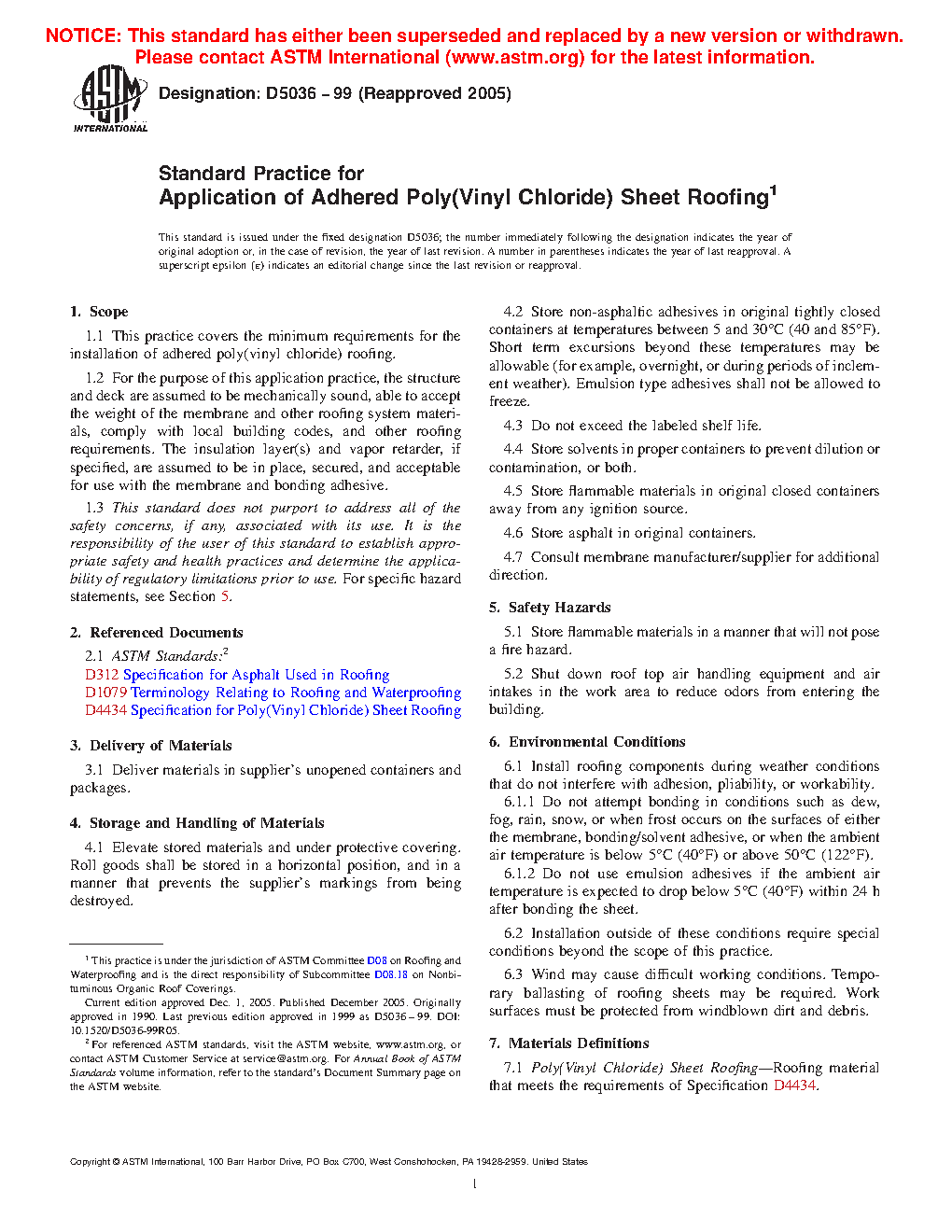 This practice covers the minimum requirements for the application of adhered poly(vinyl chloride) roofing. For the purpose of this installation practice, the structure and deck are assumed to be mechanically sound, able to accept the weight of the membrane and other roofing system materials, comply with local building codes, and other roofing requirements. The insulation layer(s) and vapor retarder, if specified, are assumed to be in place, secured, and acceptable for use with the membrane and bonding adhesive. Requirements for storage and handling of materials, safety hazards, and weather conditions for installation are given. The materials such as poly(vinyl chloride) sheet roofing, bonding adhesive, and lap seam sealant are defined. The procedures for (1) substrate preparation, (2) installation including application using solvent-based bonding adhesive, application using water-based bonding adhesive, and application using Type III asphalt as adhesive, and (3) hot air welding of lap areas are detailed.