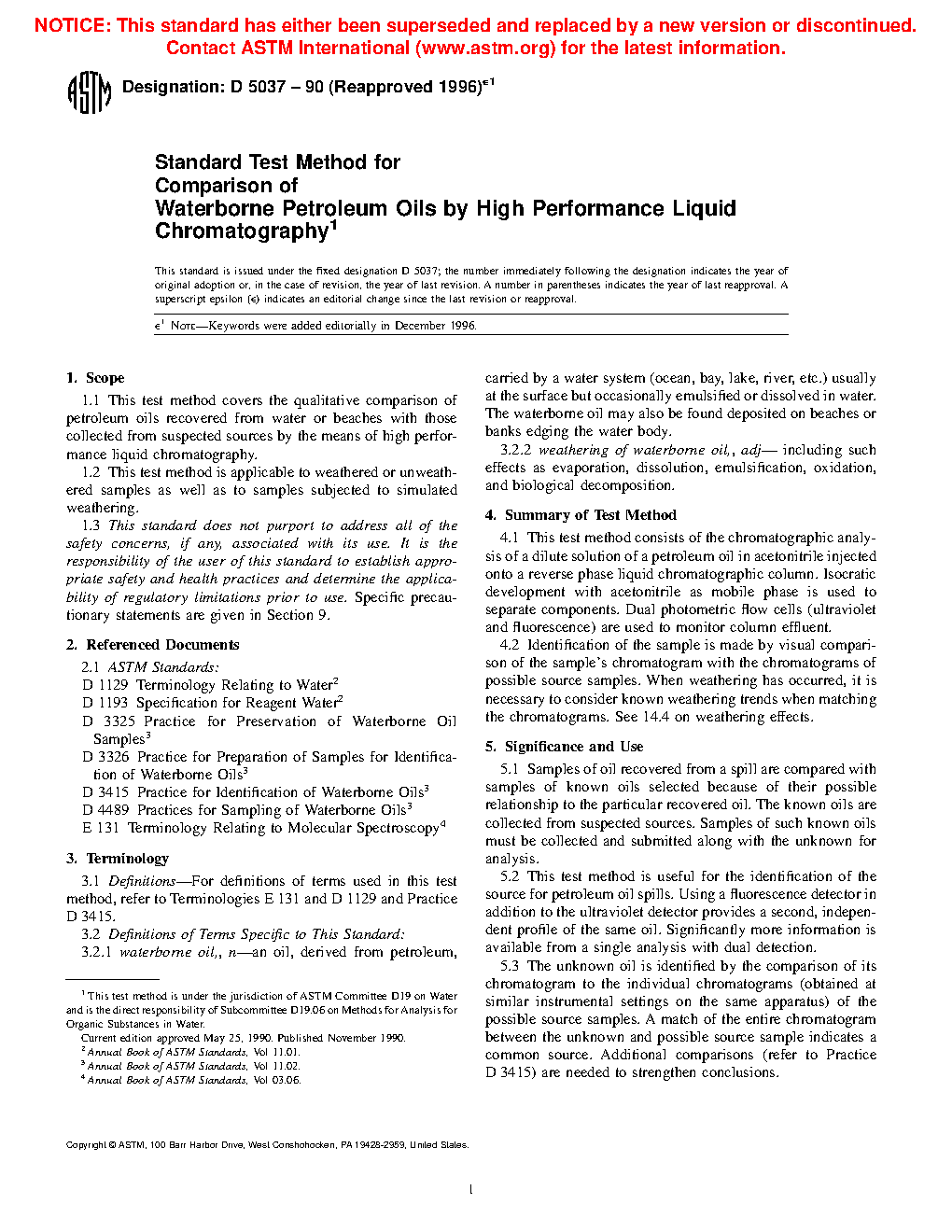 Standard Test Method for Comparison of Waterborne Petroleum Oils by High Performance Liquid Chromatography (Withdrawn 2002)