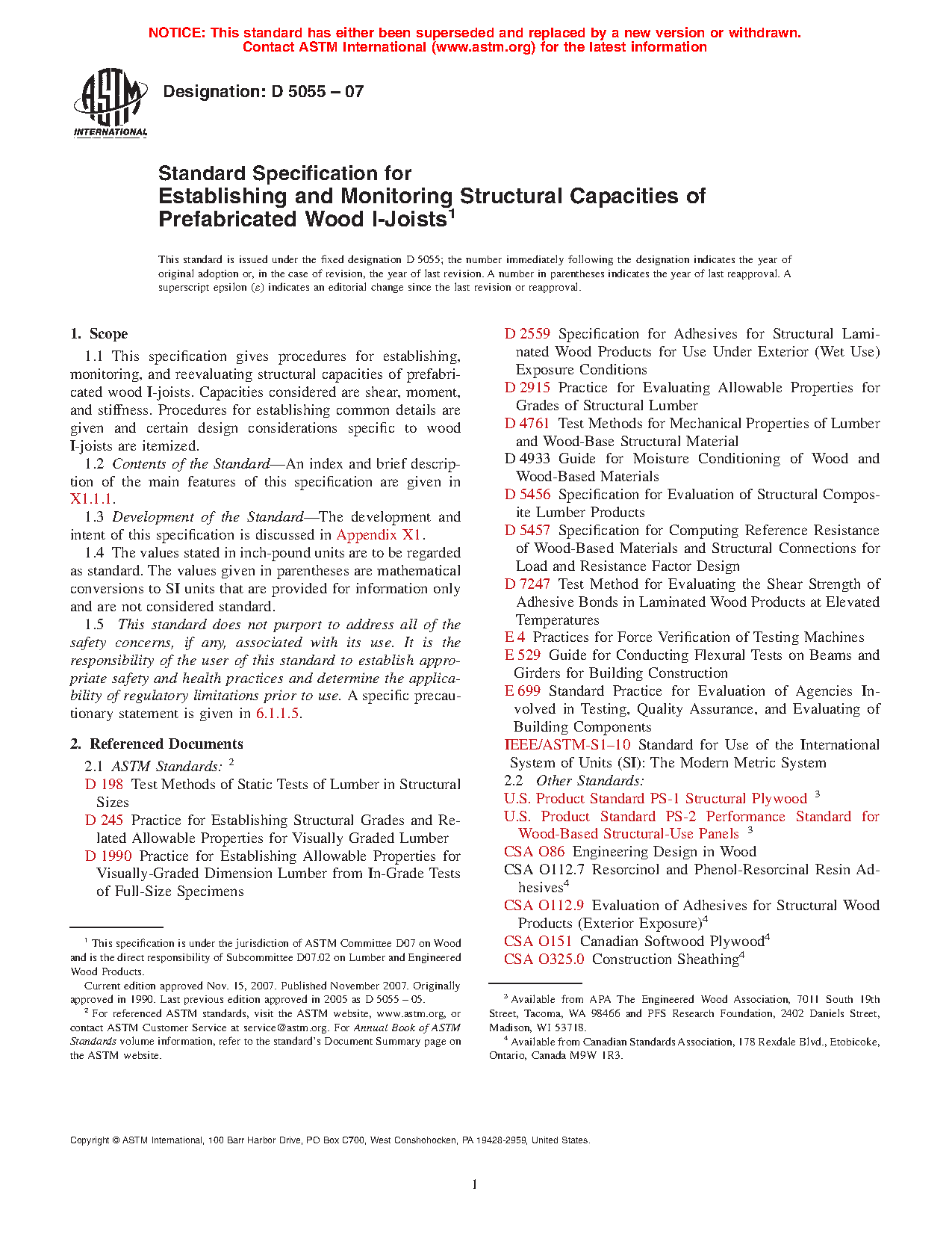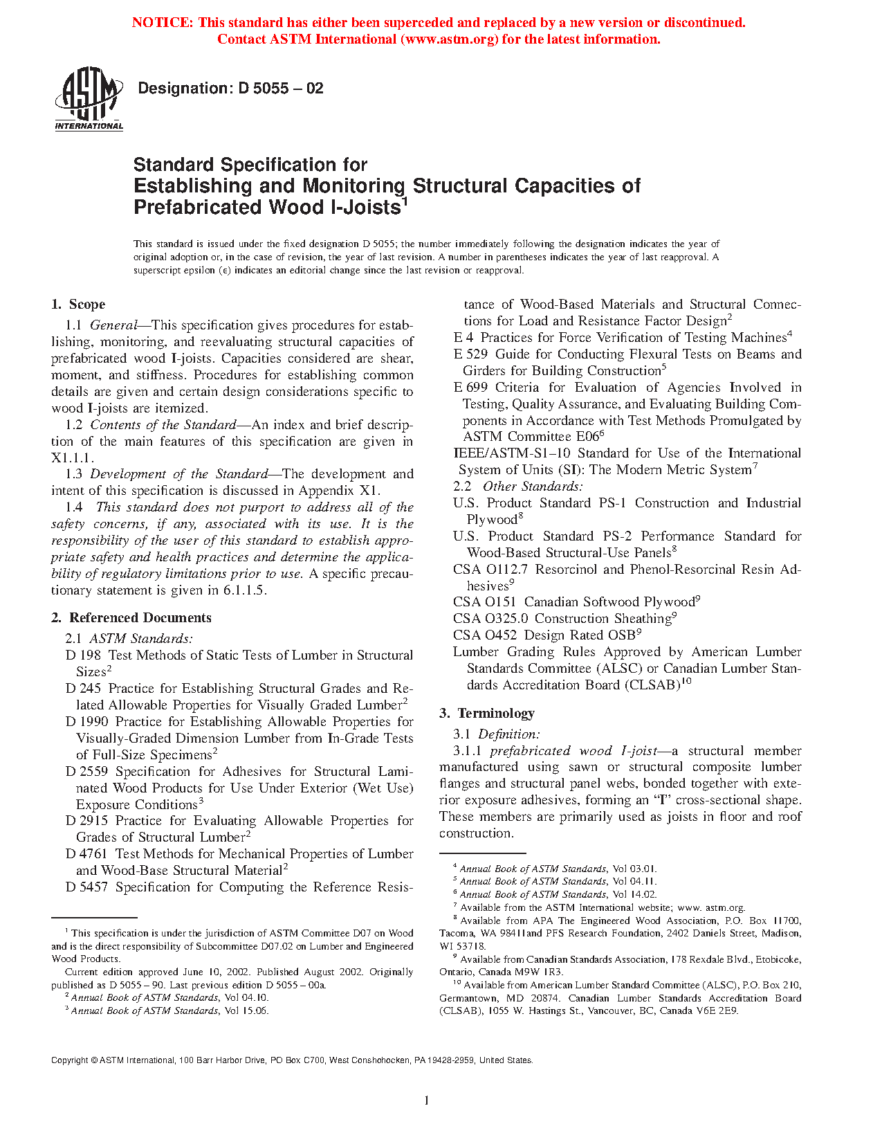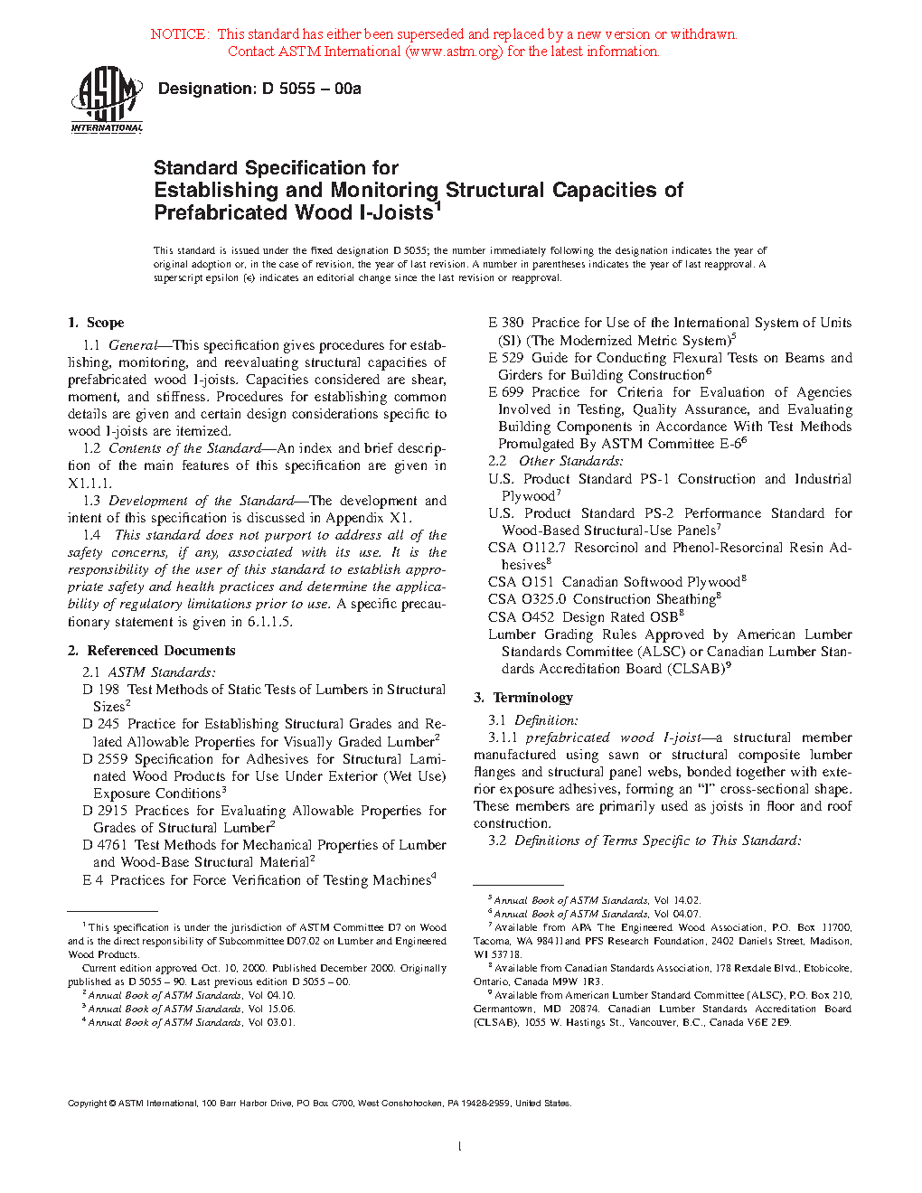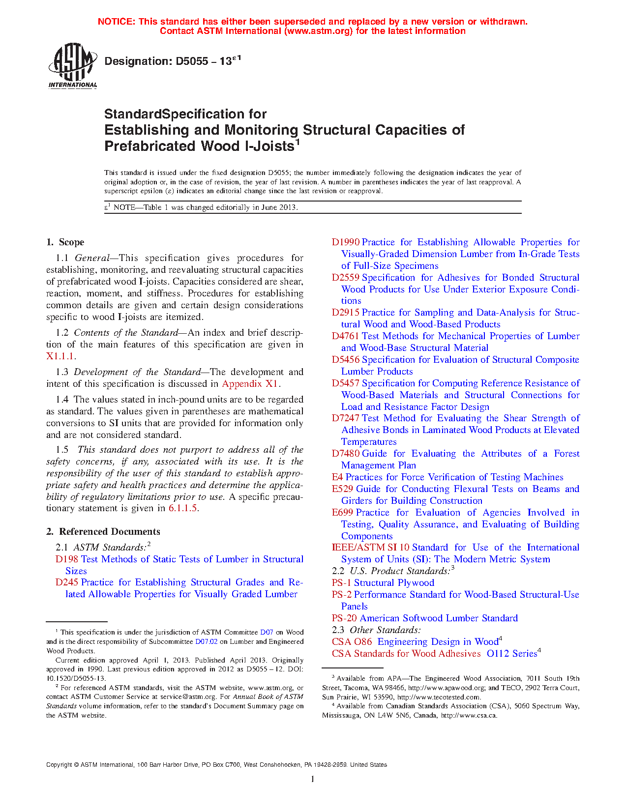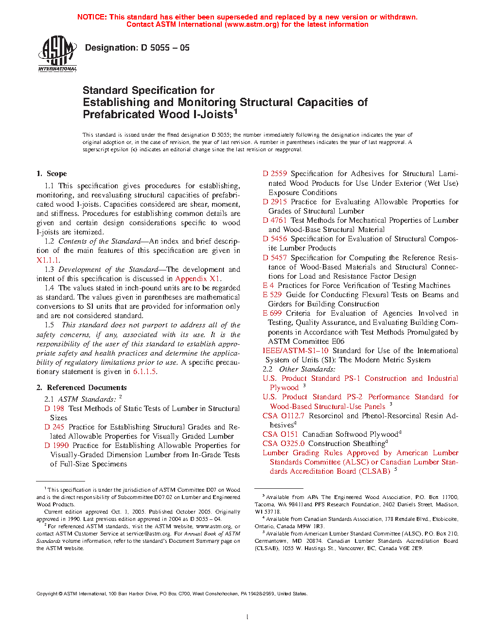 1.1 General—This specification gives procedures for establishing, monitoring, and reevaluating structural capacities of prefabricated wood I-joists. Capacities considered are shear, reaction, moment, and stiffness. Procedures for establishing common details are given and certain design considerations specific to wood I-joists are itemized.