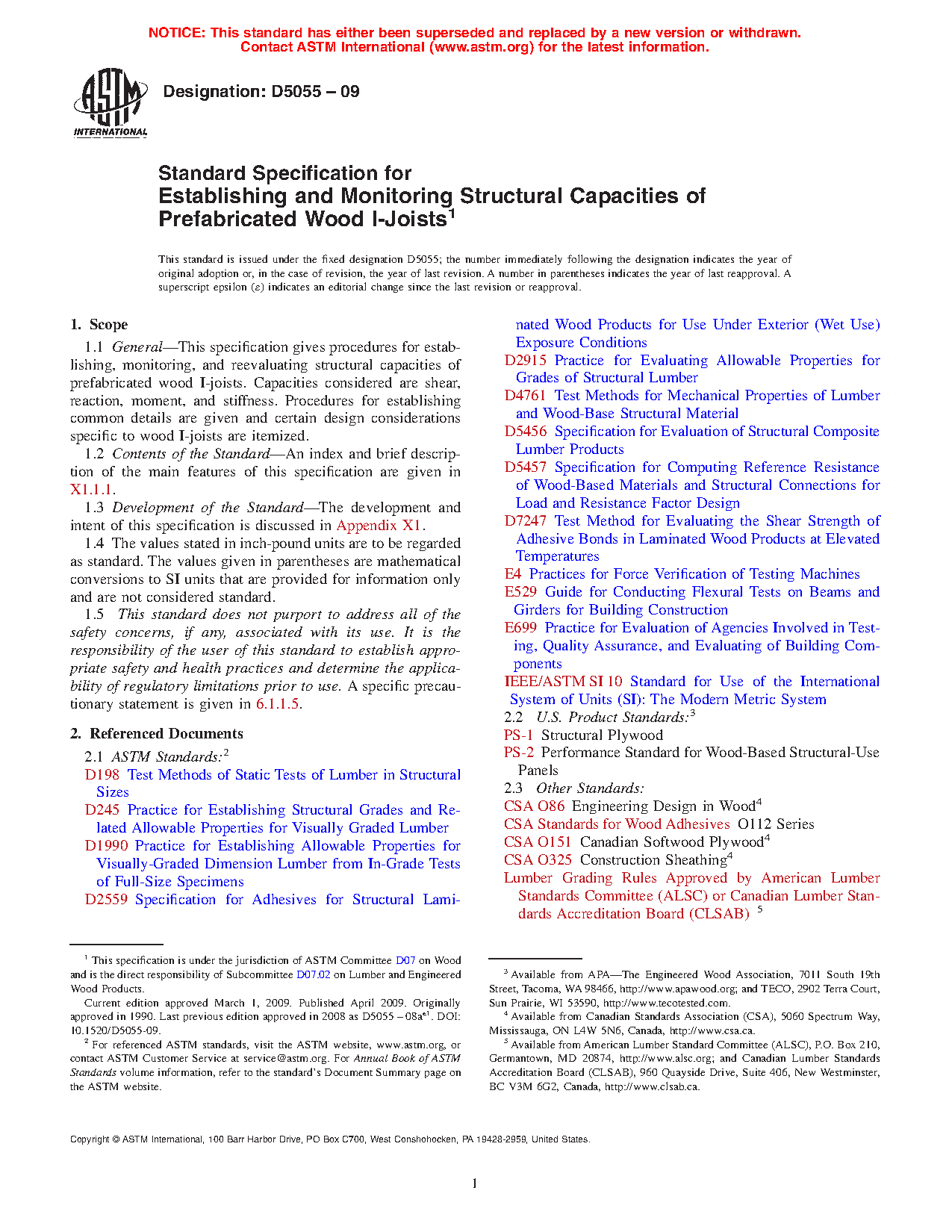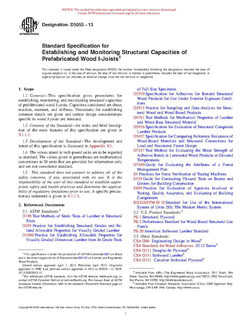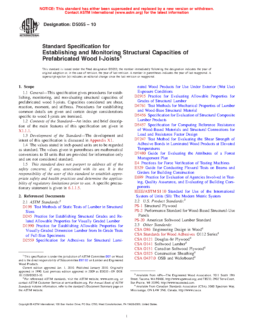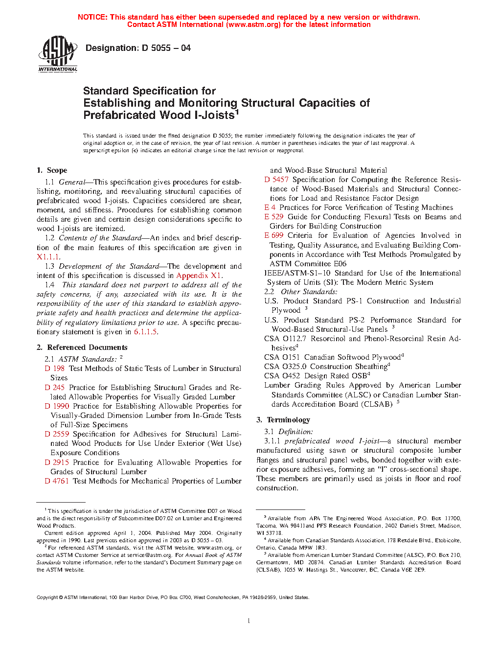 1.1 General—This specification gives procedures for establishing, monitoring, and reevaluating structural capacities of prefabricated wood I-joists. Capacities considered are shear, reaction, moment, and stiffness. Procedures for establishing common details are given and certain design considerations specific to wood I-joists are itemized.