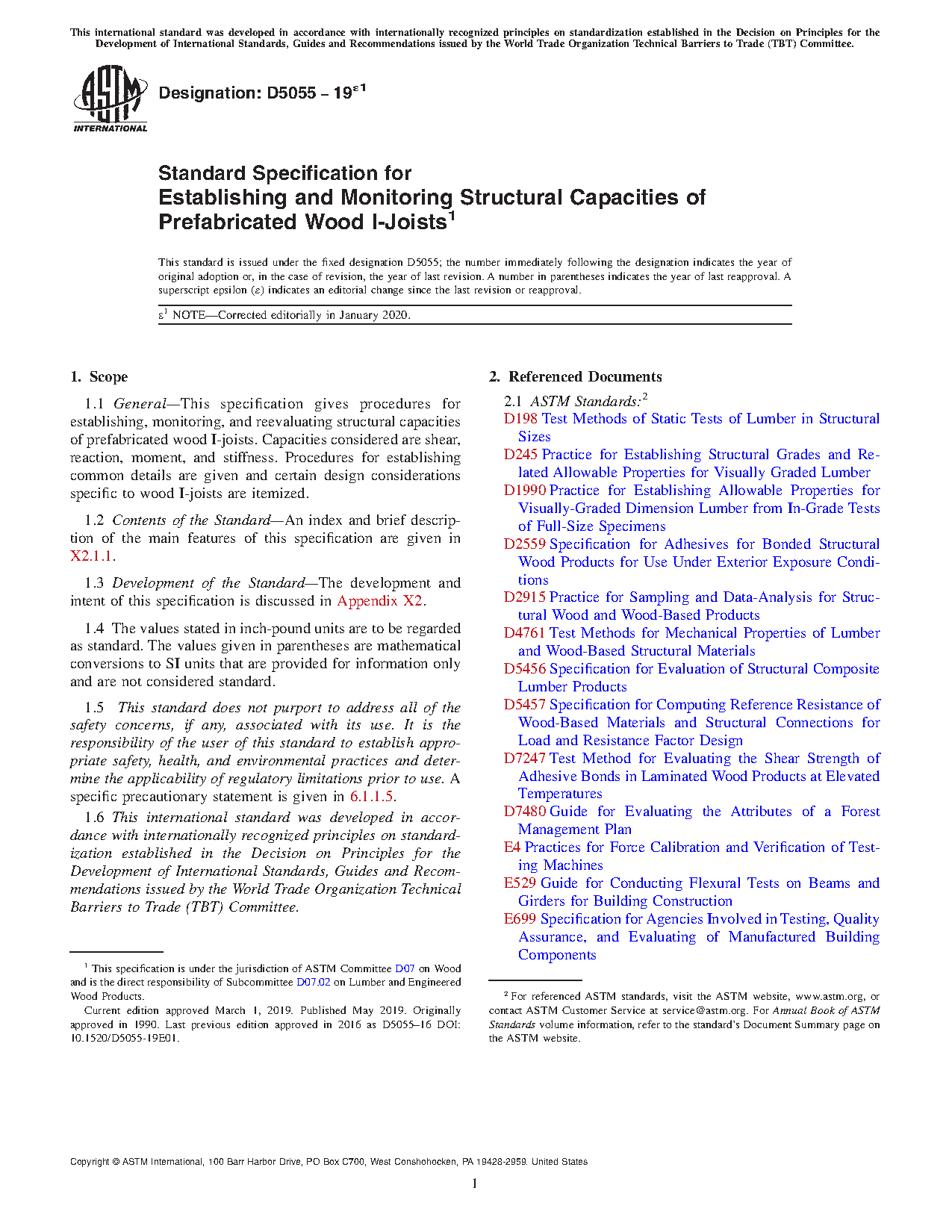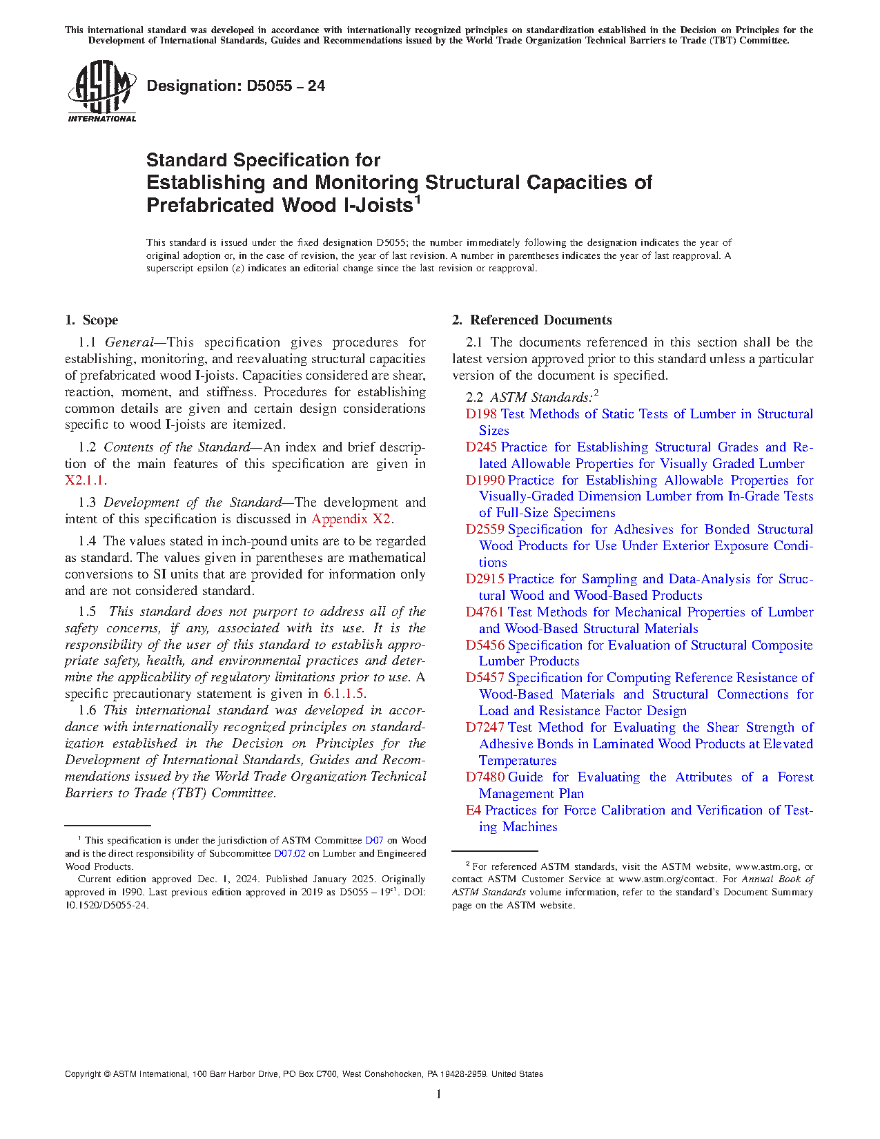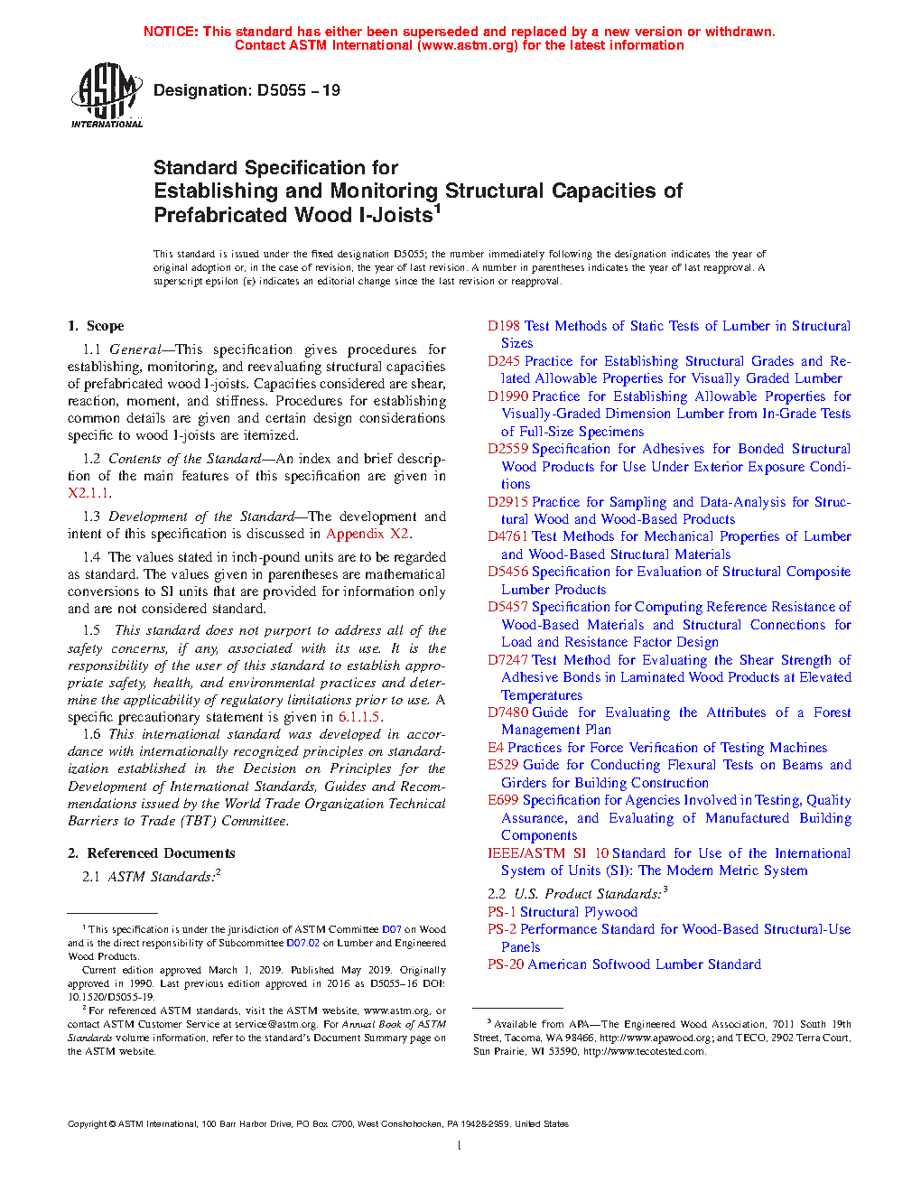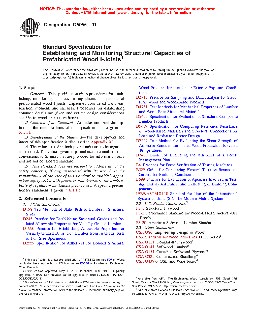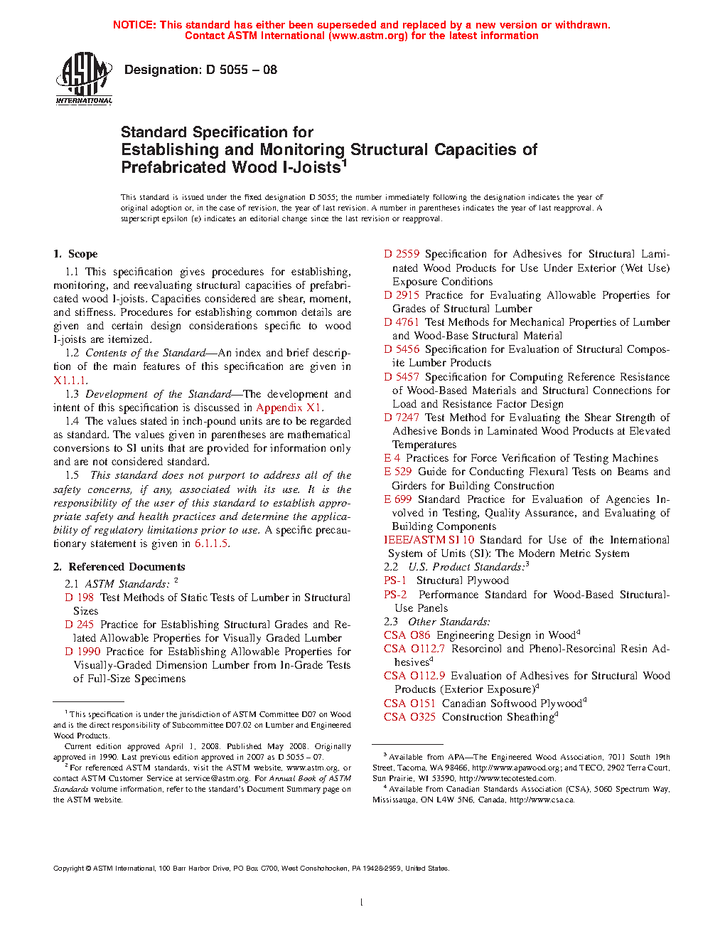 1.1 General—This specification gives procedures for establishing, monitoring, and reevaluating structural capacities of prefabricated wood I-joists. Capacities considered are shear, reaction, moment, and stiffness. Procedures for establishing common details are given and certain design considerations specific to wood I-joists are itemized.