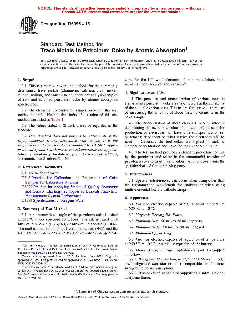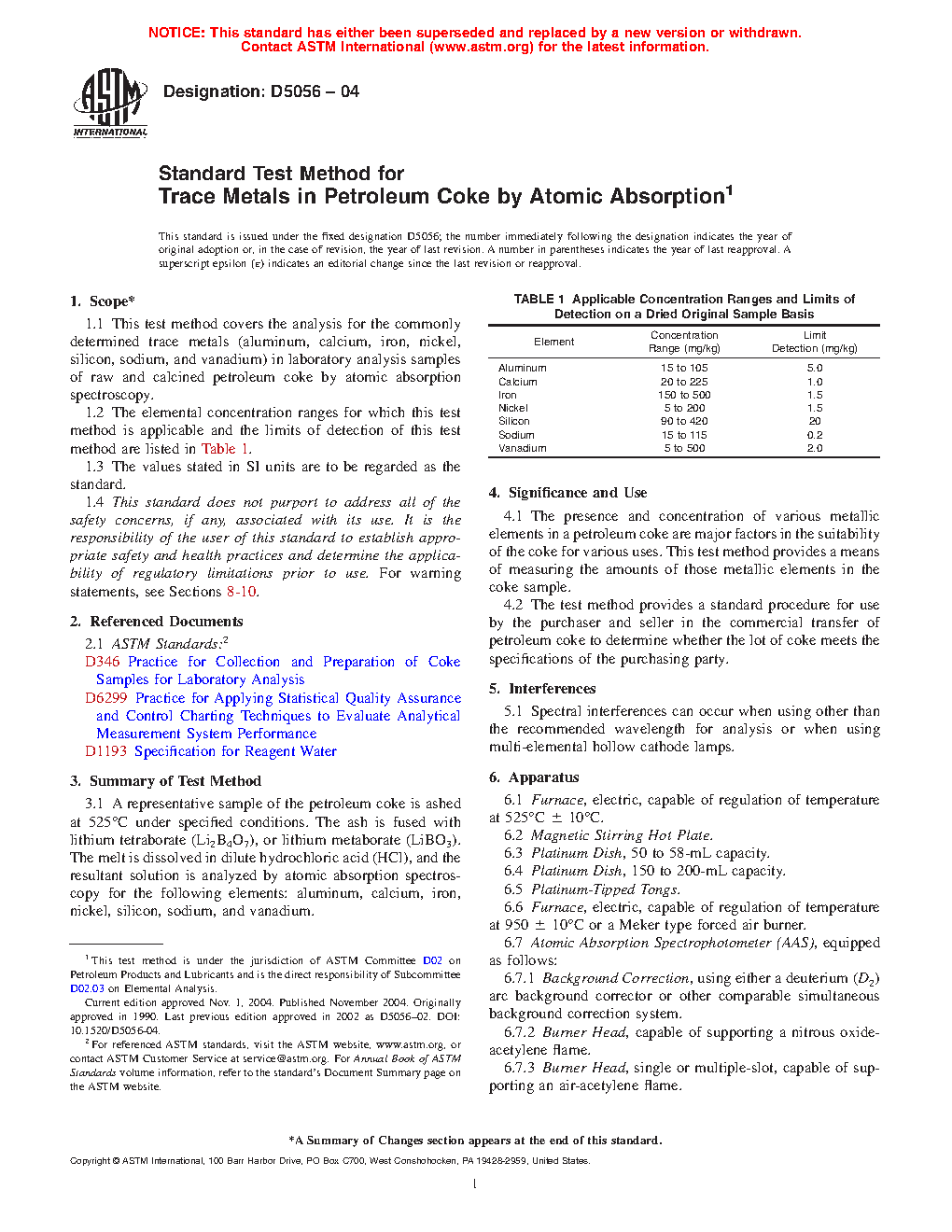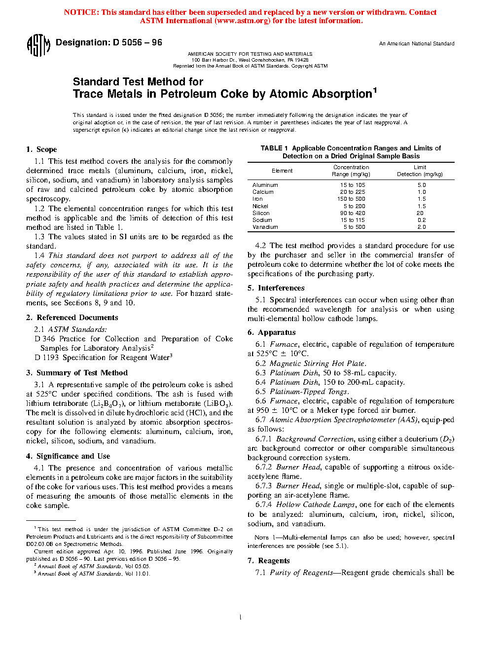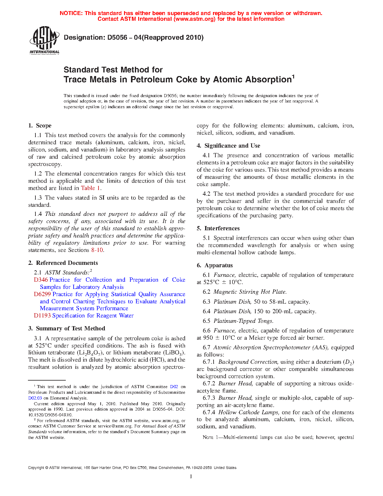 1.1 This test method covers the analysis for the commonly determined trace metals (aluminum, calcium, iron, nickel, silicon, sodium, and vanadium) in laboratory analysis samples of raw and calcined petroleum coke by atomic absorption spectroscopy.