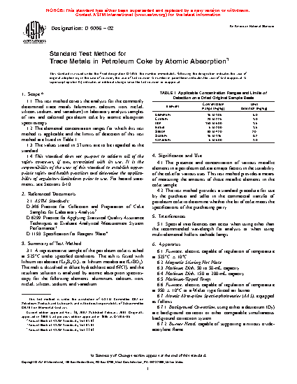 1.4 This standard does not purport to address all of the safety concerns, if any, associated with its use. It is the responsibility of the user of this standard to establish appropriate safety and health practices and determine the applicability of regulatory limitations prior to use. The presence and concentration of various metallic elements in a petroleum coke are major factors in the suitability of the coke for various uses. This test method provides a means of measuring the amounts of those metallic elements in the coke sample. The test method provides a standard procedure for use by the purchaser and seller in the commercial transfer of petroleum coke to determine whether the lot of coke meets the specifications of the purchasing party.