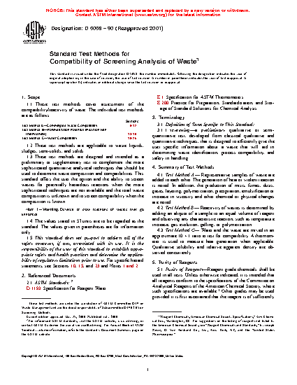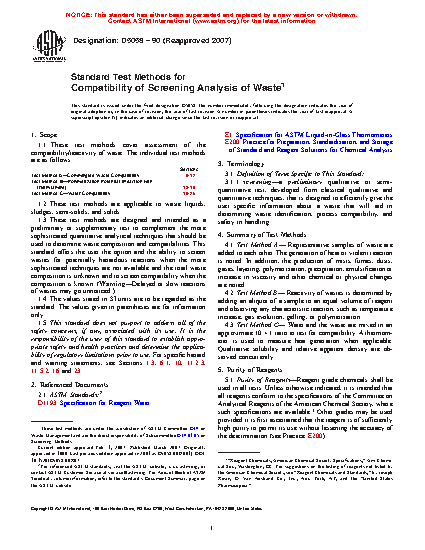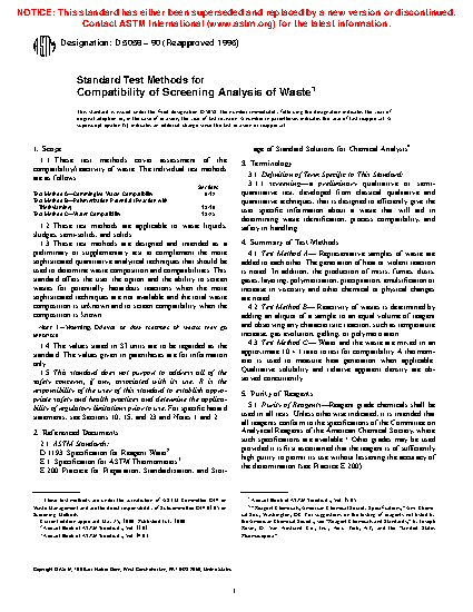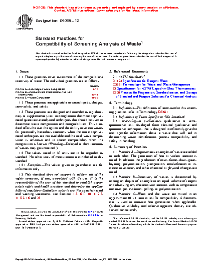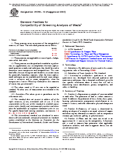 1.1 These practices cover assessment of the compatibility/reactivity of waste. The individual practices are as follows:
