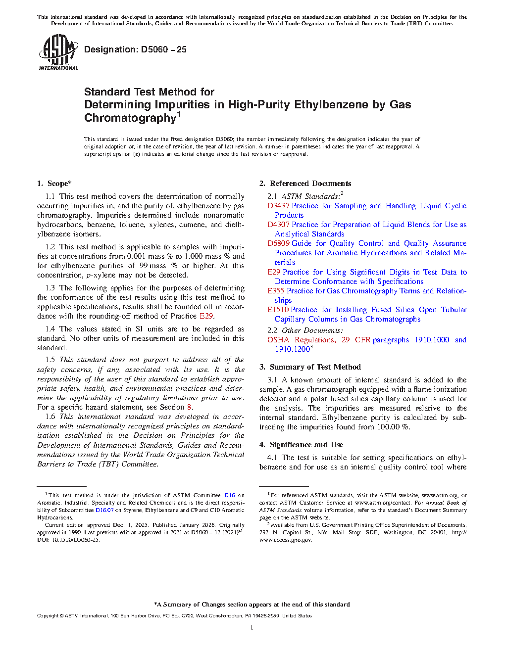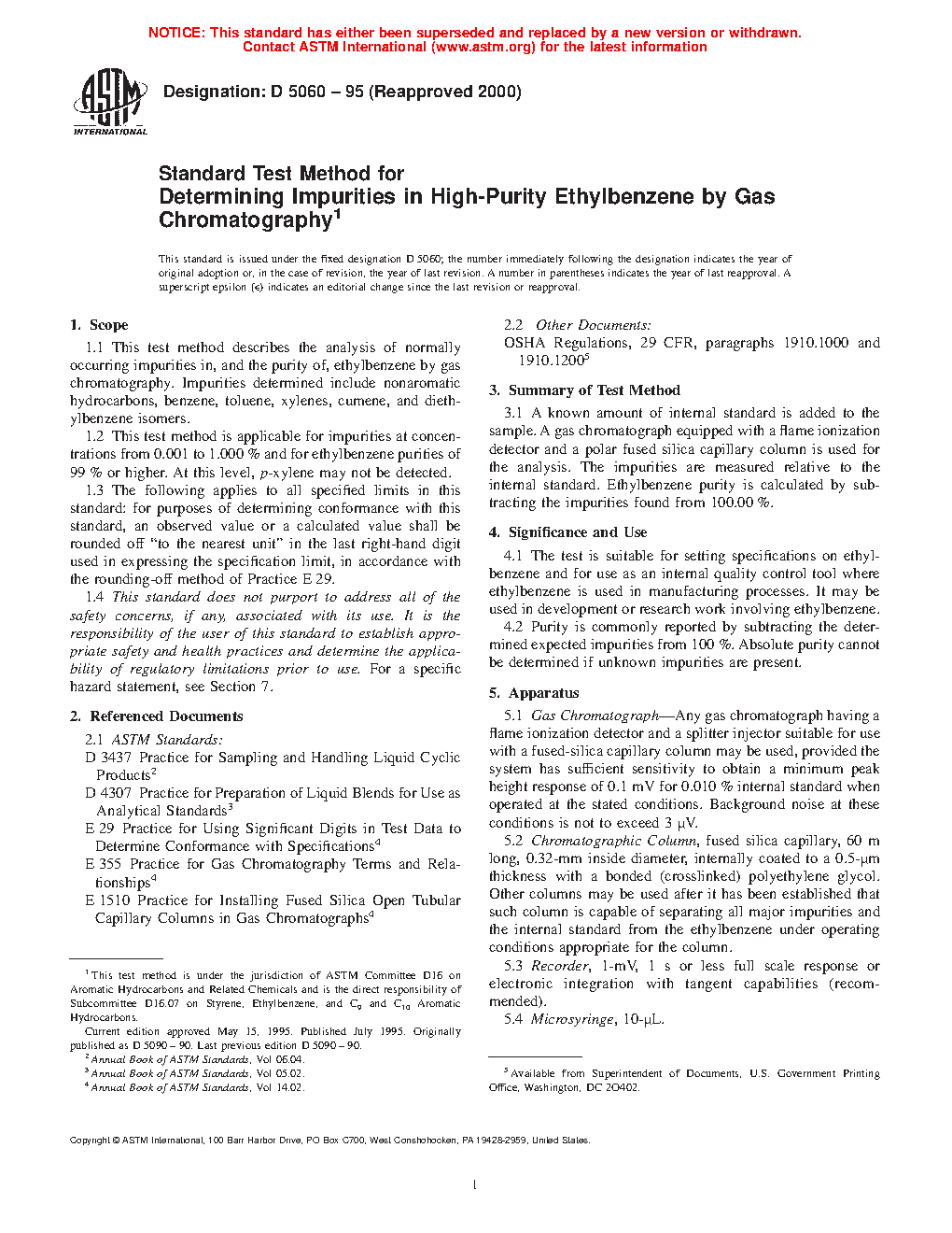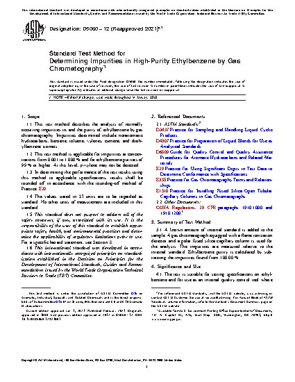 1.1 This test method describes the analysis of normally occurring impurities in, and the purity of, ethylbenzene by gas chromatography. Impurities determined include nonaromatic hydrocarbons, benzene, toluene, xylenes, cumene, and diethylbenzene isomers.