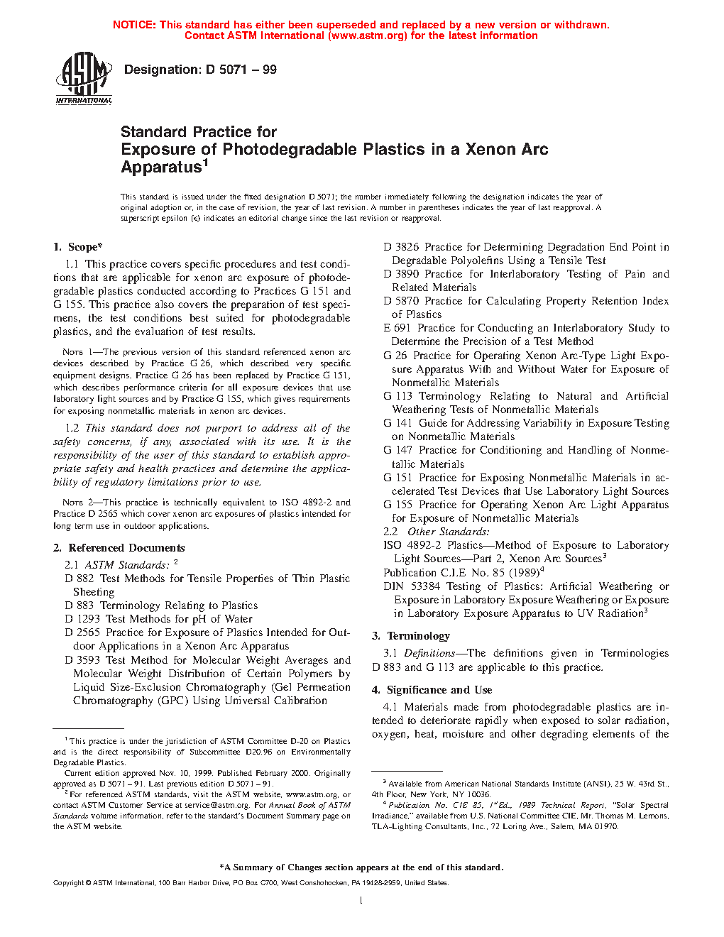Note 1: This practice is technically equivalent to ISO 4892-2 and Practice D2565 which cover xenon arc exposures of plastics intended for long term use in outdoor applications.