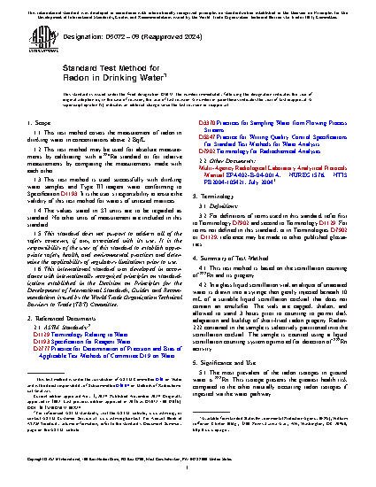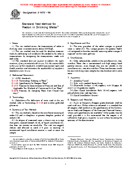 1.1 This test method covers the measurement of radon in drinking water in concentrations above 2 Bq/L.