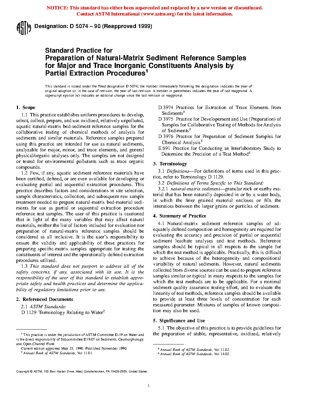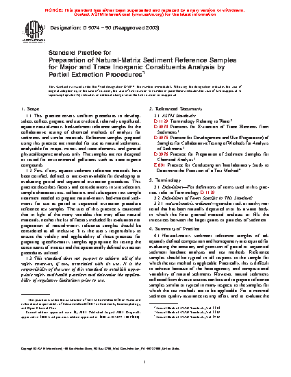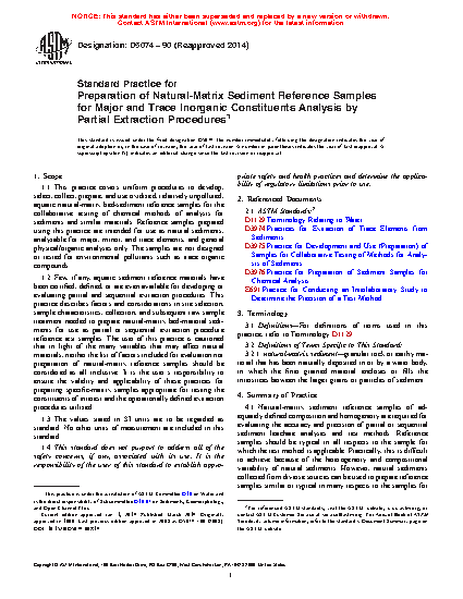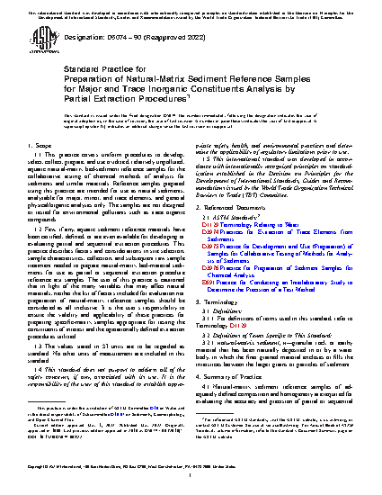 1.2 Few, if any, aquatic sediment reference materials have been certified, defined, or are even available for developing or evaluating partial and sequential extraction procedures. This practice describes factors and considerations in site selection, sample characteristics, collection, and subsequent raw sample treatment needed to prepare natural-matrix bed-material sediments for use as partial or sequential extraction procedure reference test samples. The user of this practice is cautioned that in light of the many variables that may affect natural materials, neither the list of factors included for evaluation nor preparation of natural-matrix reference samples should be considered as all inclusive. It is the user's responsibility to ensure the validity and applicability of these practices for preparing specific-matrix samples appropriate for testing the constituents of interest and the operationally defined extraction procedures utilized.