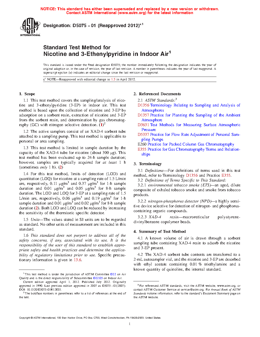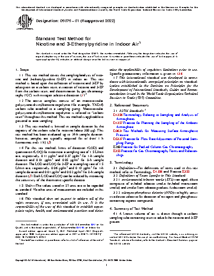 1.1 This test method covers the sampling/analysis of nicotine and 3-ethenylpyridine (3-EP) in indoor air. This test method is based upon the collection of nicotine and 3-EP by adsorption on a sorbent resin, extraction of nicotine and 3-EP from the sorbent resin, and determination by gas chromatography (GC) with nitrogen selective detection (1).2