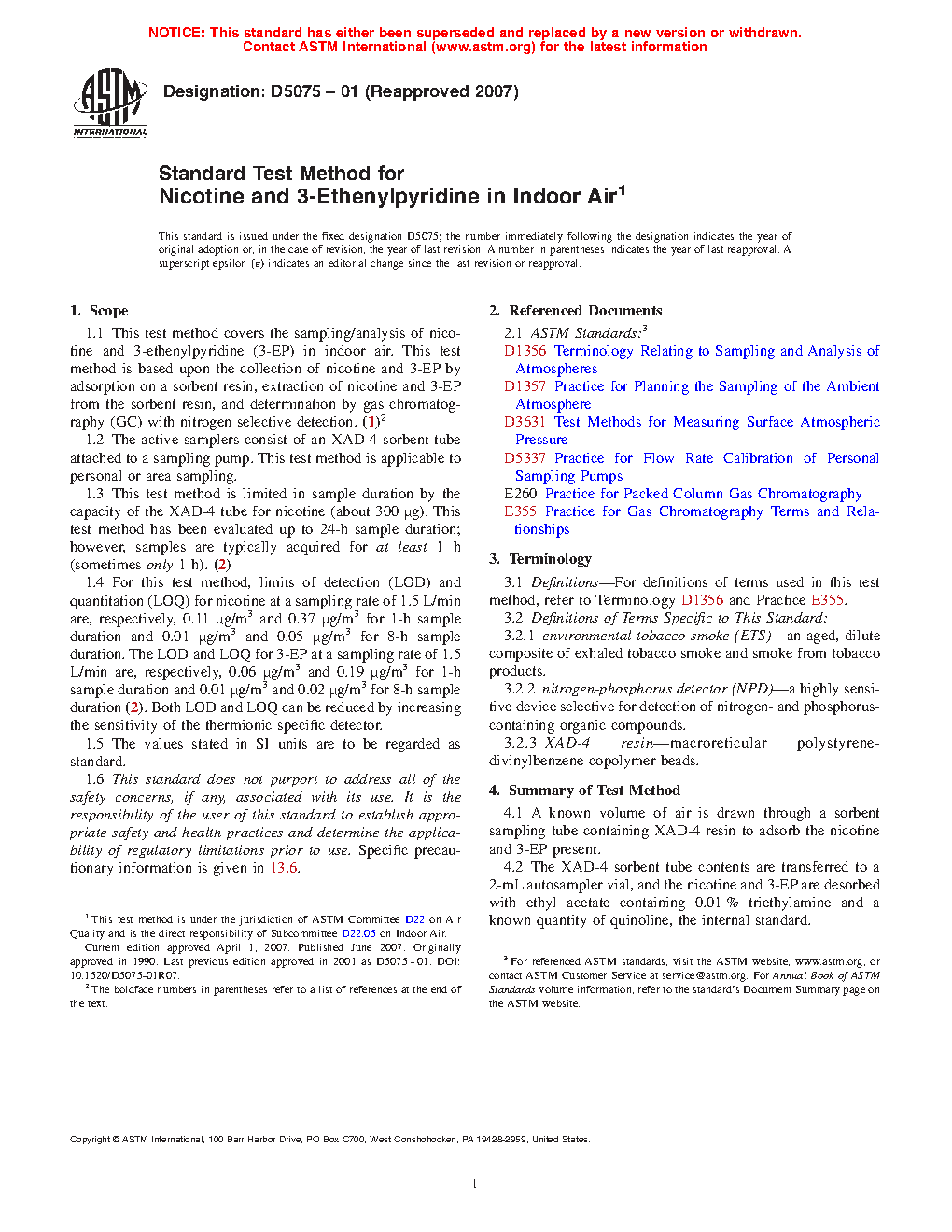 1.4 For this test method, limits of detection (LOD) and quantitation (LOQ) for nicotine at a sampling rate of 1.5 L/min are, respectively, 0.11 µg/m3 and 0.37 µg/m 3 for 1-h sample duration and 0.01 µg/m3 and 0.05 µg/m3 for 8-h sample duration. The LOD and LOQ for 3-EP at a sampling rate of 1.5 L/min are, respectively, 0.06 µg/m 3 and 0.19 µg/m3 for 1-h sample duration and 0.01 µg/m3 and 0.02 µg/m3 for 8-h sample duration (2). Both LOD and LOQ can be reduced by increasing the sensitivity of the thermionic specific detector.