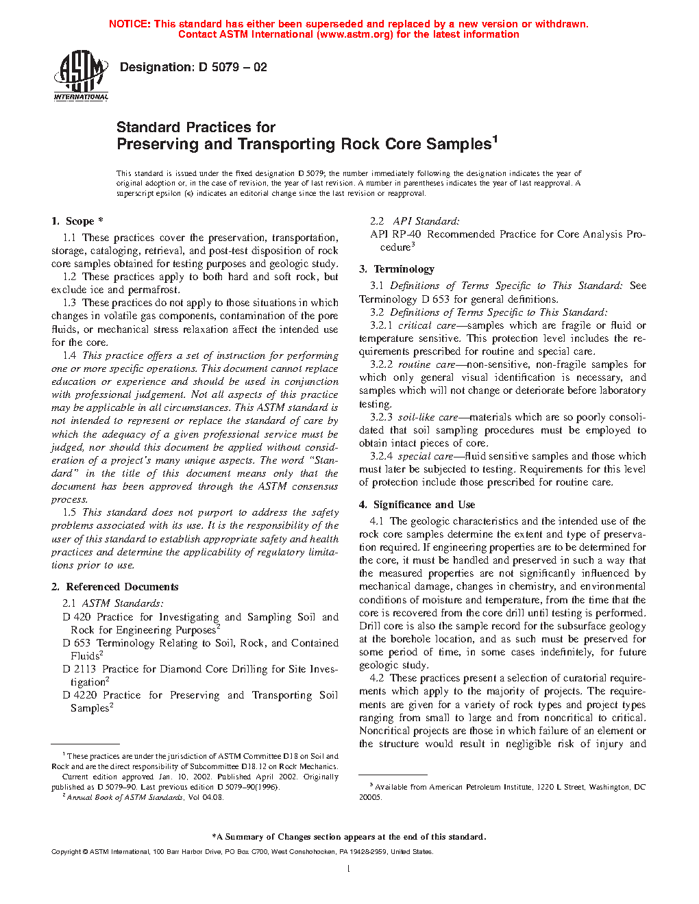 4.1 The geologic characteristics and the intended use of the rock core samples determine the extent and type of preservation and transportation required. If engineering properties are to be determined for the core, it must be handled and preserved in such a way that the measured properties are not significantly influenced by mechanical damage, changes in chemistry, and environmental conditions of moisture and temperature, from the time that the core is recovered from the drill core barrel and until testing is performed. Drill core is also the sample record for the subsurface geology at the borehole location, and as such must be preserved for some period of time, in some cases indefinitely, for future geologic study or core showings for design or the bidding process.