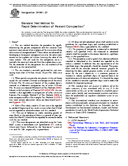 1.1 This test method describes the procedure for rapidly determining the percent compaction and the variation from optimum water content of an in-place soil for use in controlling construction of compacted earth. These values are obtained by developing a three-point compaction curve at the same water content as the in-place soil without knowing the value of the water content. The soil used for the compaction curve is normally the same soil removed from the in-place density test. For the remainder of this designation, this test method will be referred to as the rapid method.