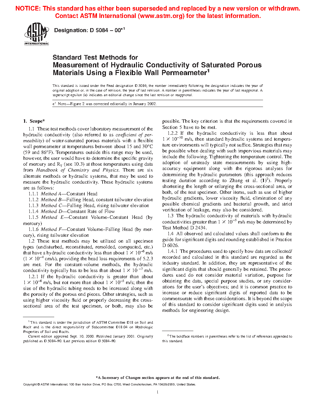 4.2 The hydraulic conductivity of porous materials generally decreases with an increasing amount of air in the pores of the material. These test methods apply to water-saturated porous materials containing virtually no air.